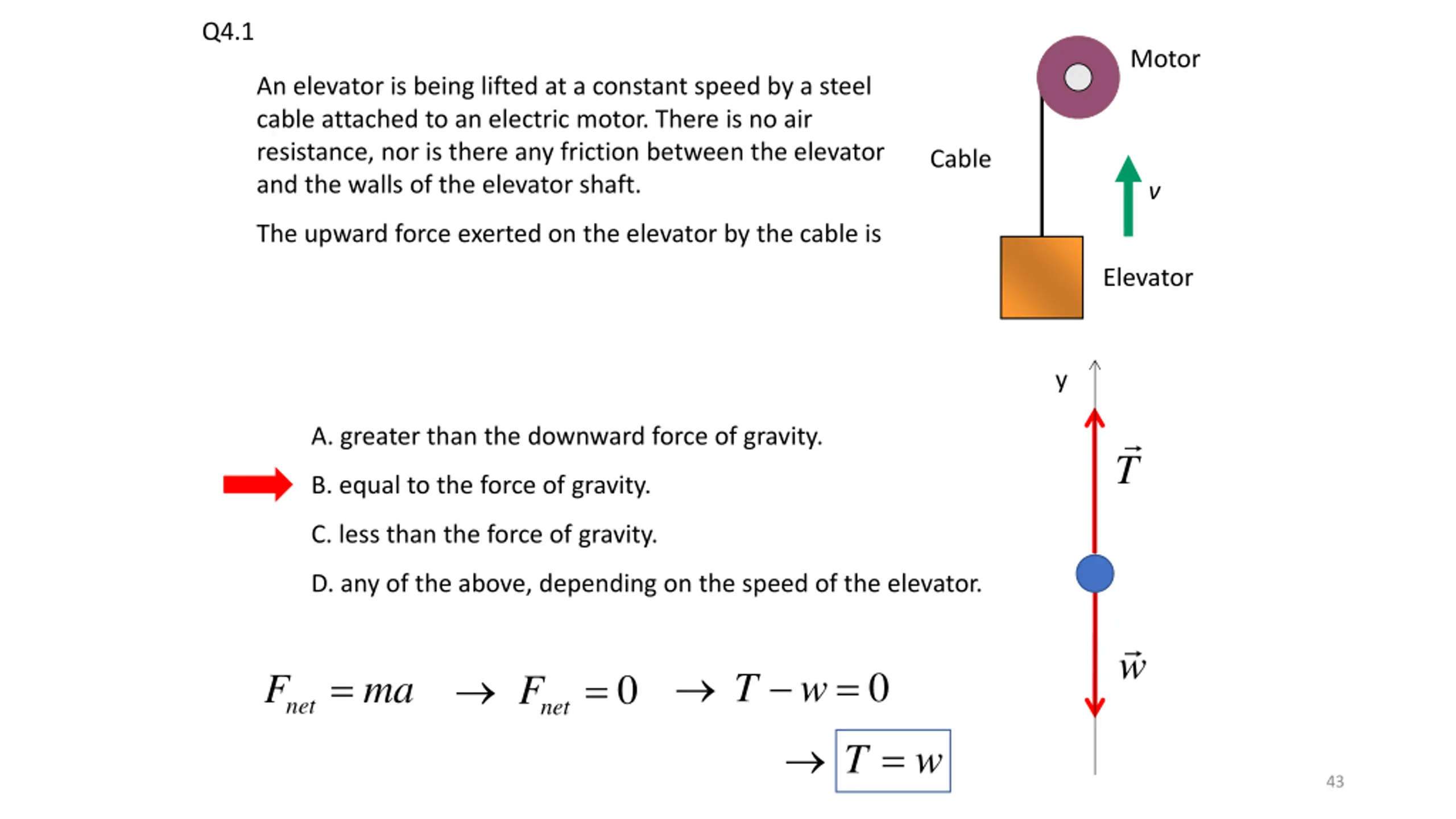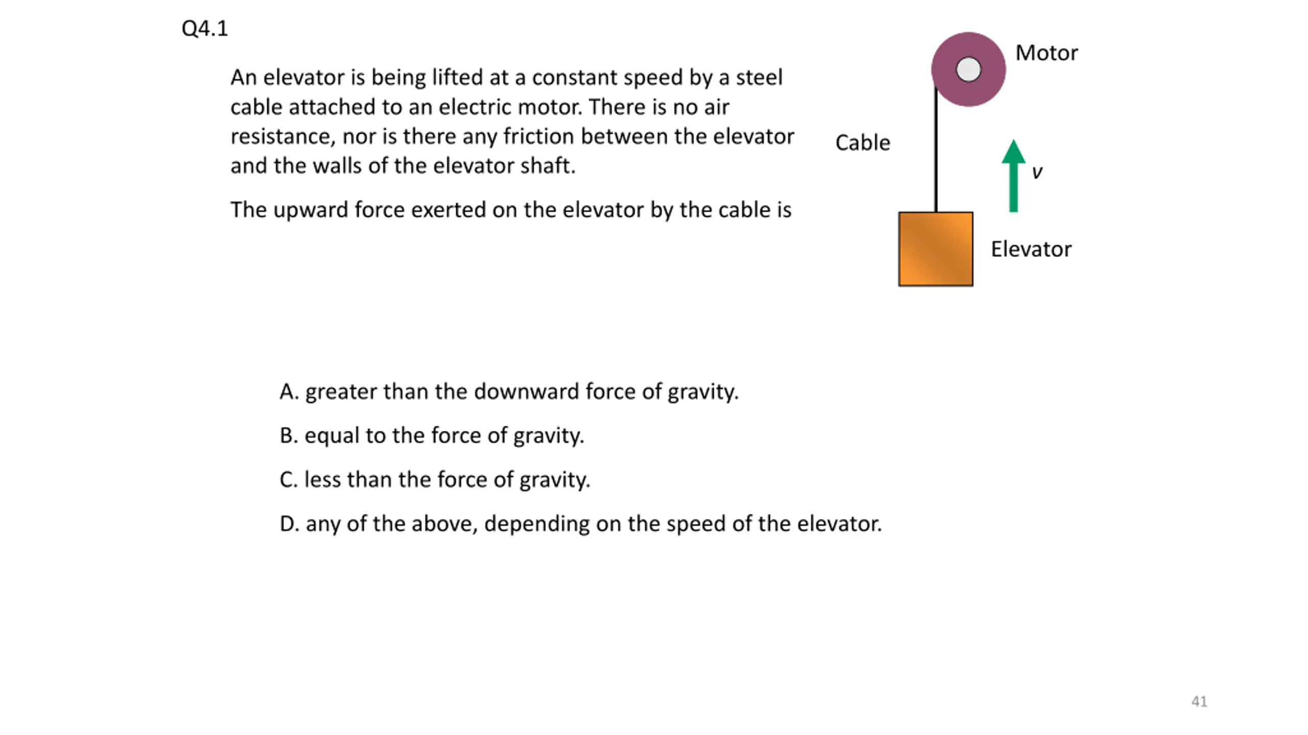 Q4.1 Motor An elevator is being lifted at a constant speed by a steel cable attached to an electric motor. There is no air resistance, nor is there any friction between the elevator and the walls of the elevator shaft. Cable v The upward force exerted on the elevator by the cable is Elevator A. greater than the downward force of gravity. B. equal to the force of gravity. C. less than the force of gravity. D. any of the above, depending on the speed of the elevator. 41