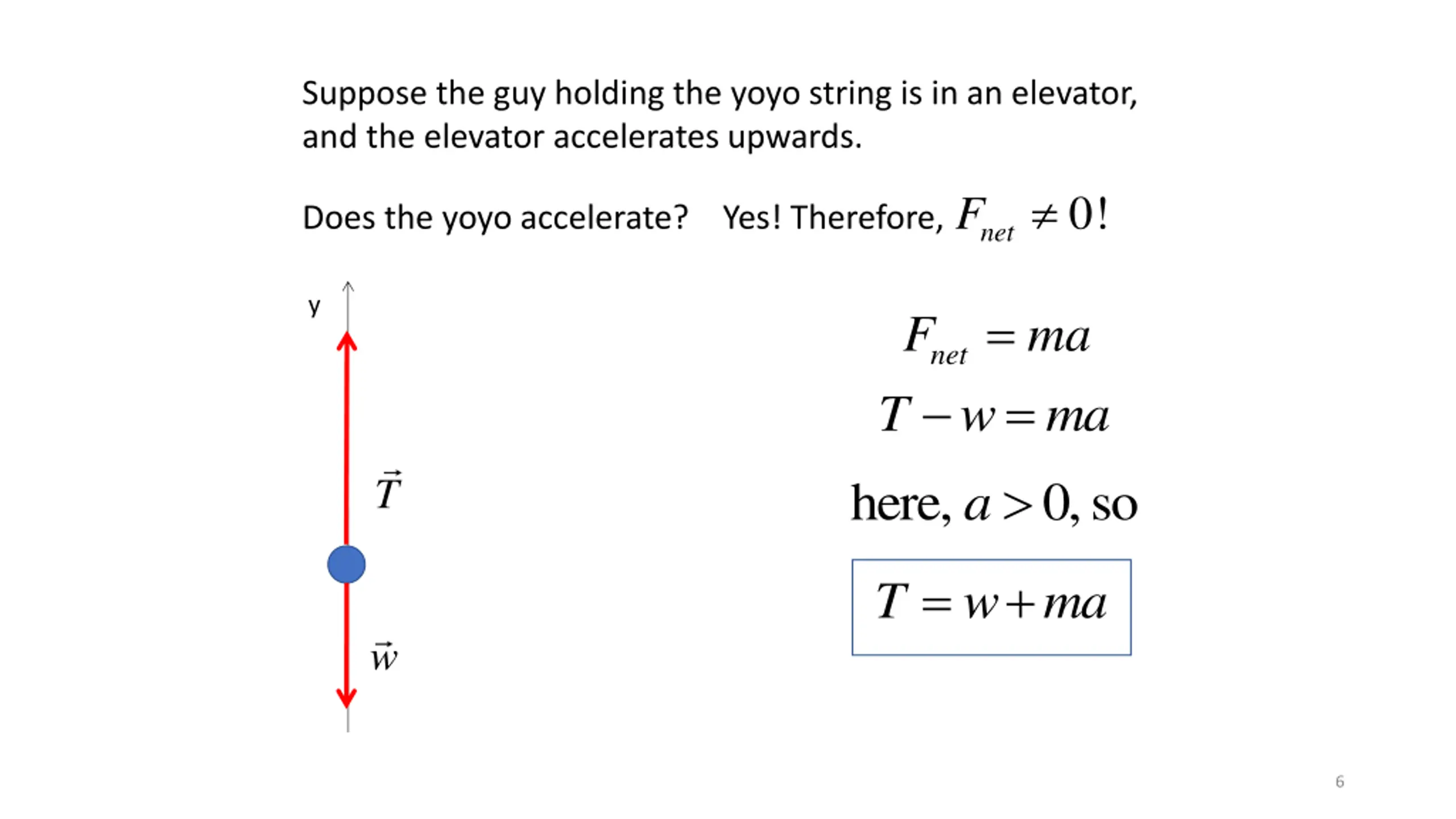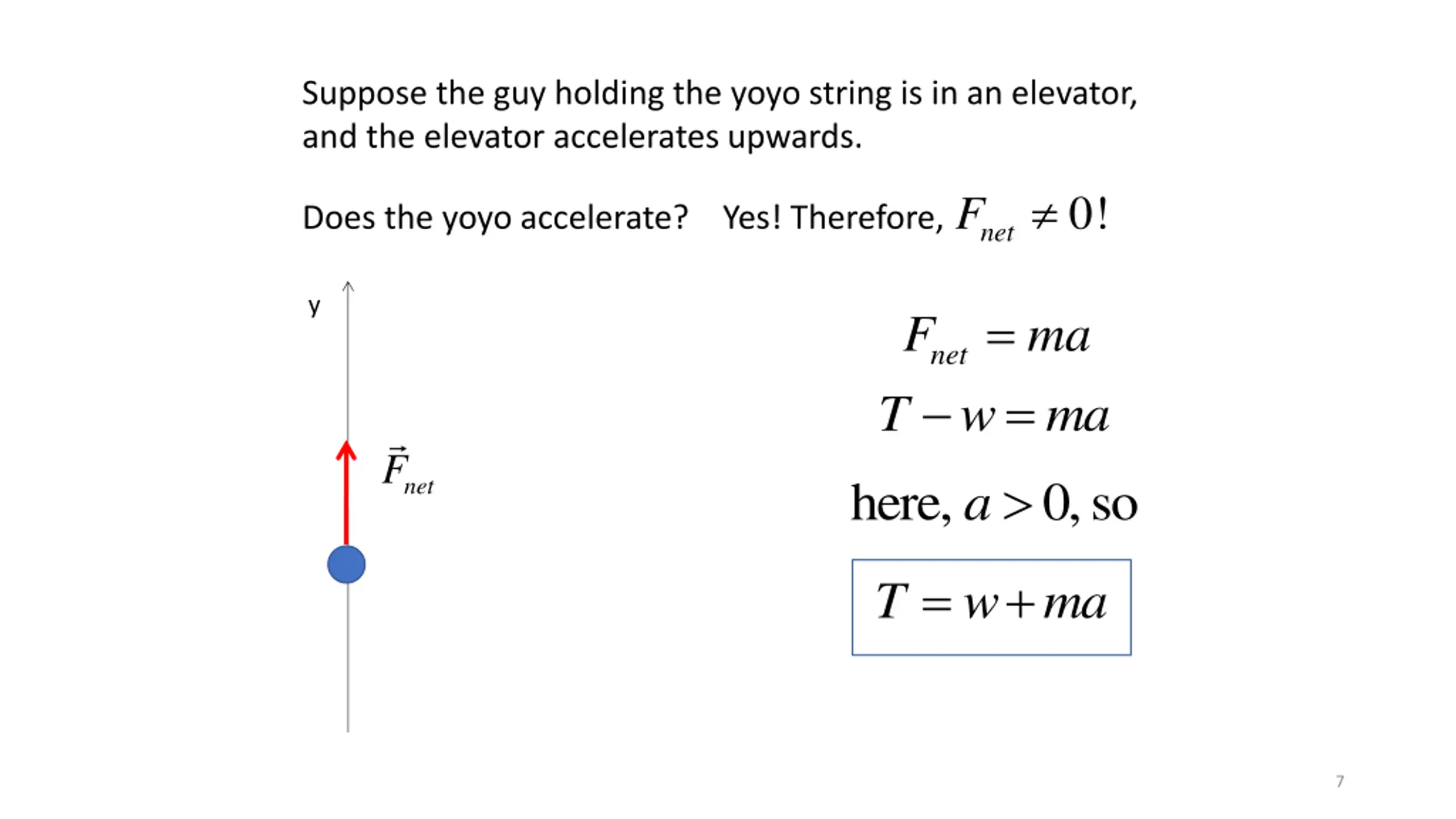 Suppose the guy holding the yoyo string is in an elevator, and the elevator accelerates upwards. 0! F Does the yoyo accelerate? Yes! Therefore, net y = F ma ma = a net T w T here, 0,so = w ma + T w 6