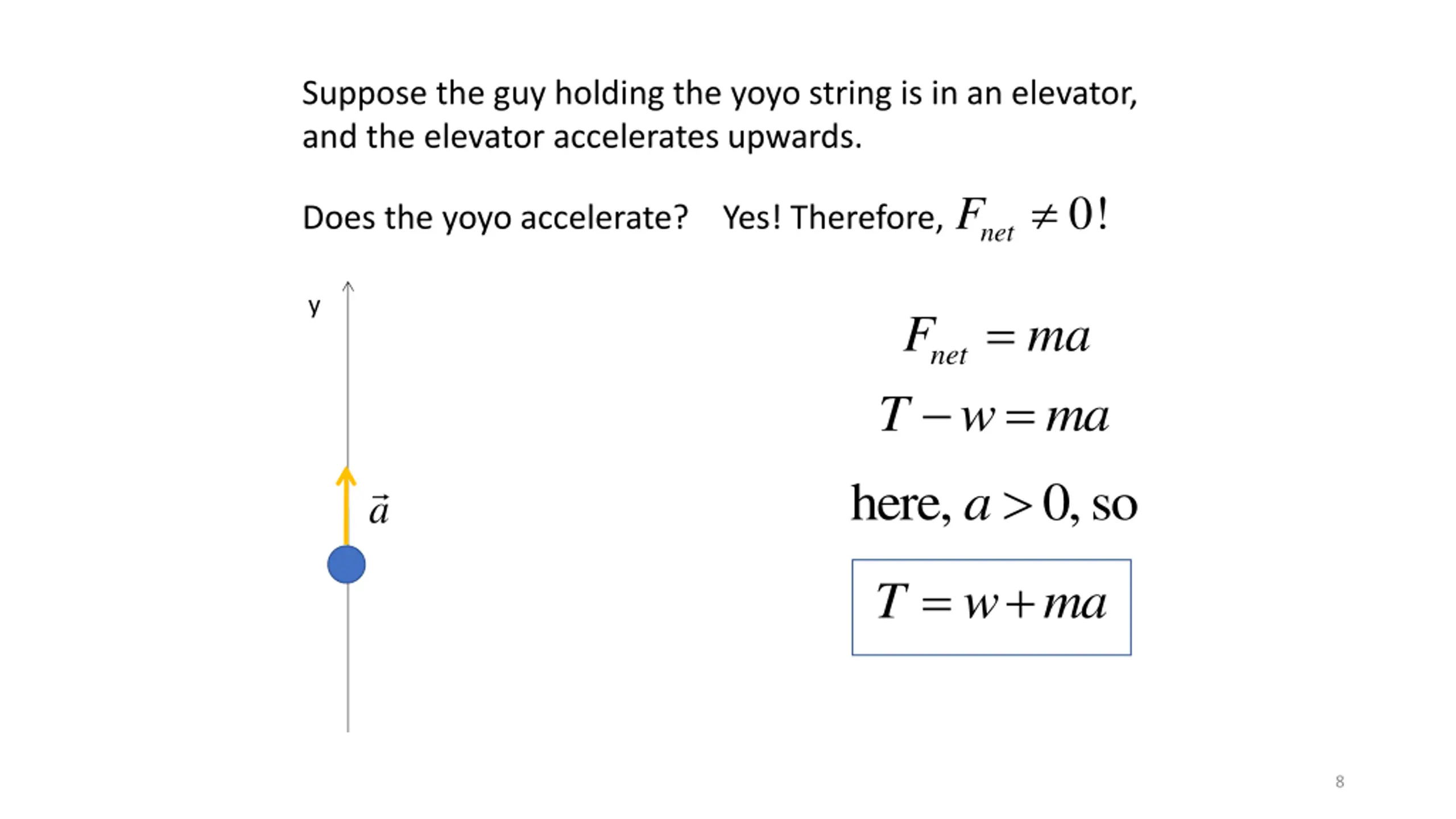 Suppose the guy holding the yoyo string is in an elevator, and the elevator accelerates upwards. 0! F Does the yoyo accelerate? Yes! Therefore, net y = F ma ma = a net T w F here, 0,so net = w ma + T 7