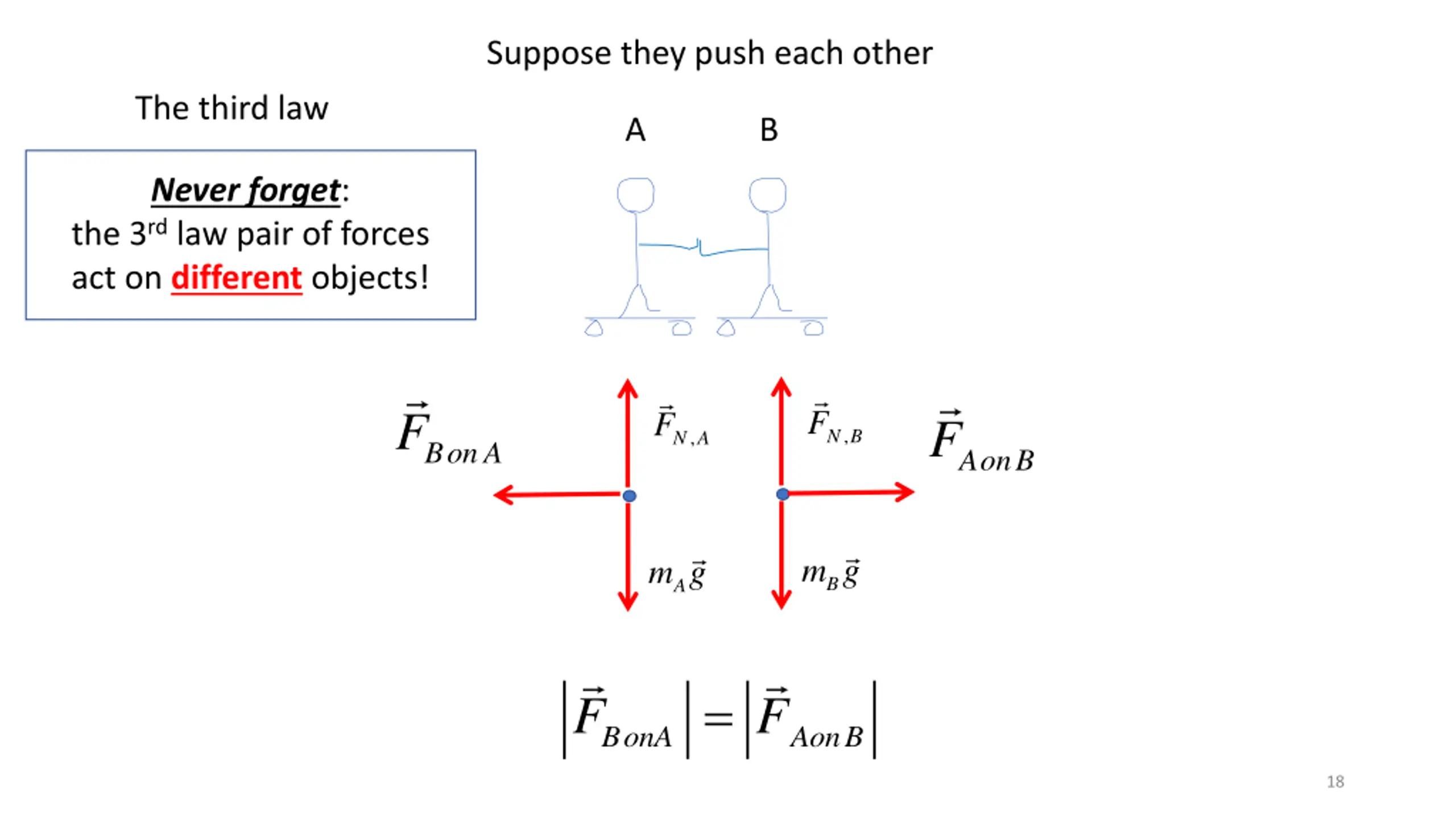 Suppose they push each other The third law A B Never forget: the 3rd law pair of forces act on different objects! BonA F F F AonB F , N B , N A m g m g B A = BonA F F AonB 18
