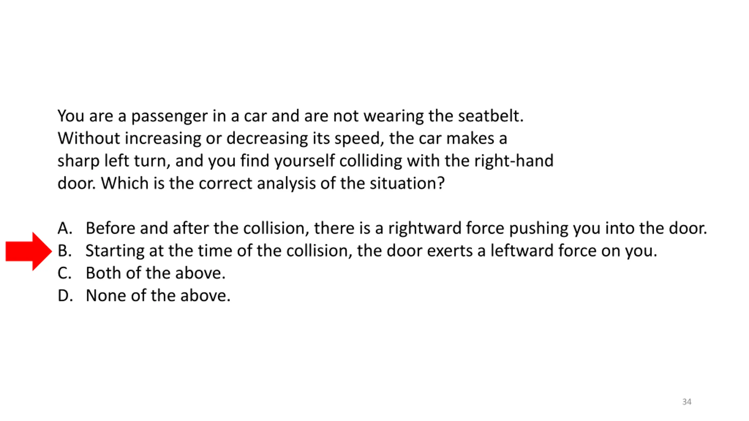 You are a passenger in a car and are not wearing the seatbelt. Without increasing or decreasing its speed, the car makes a sharp left turn, and you find yourself colliding with the right-hand door. Which is the correct analysis of the situation? A. Before and after the collision, there is a rightward force pushing you into the door. B. Starting at the time of the collision, the door exerts a leftward force on you. C. Both of the above. D. None of the above. 34