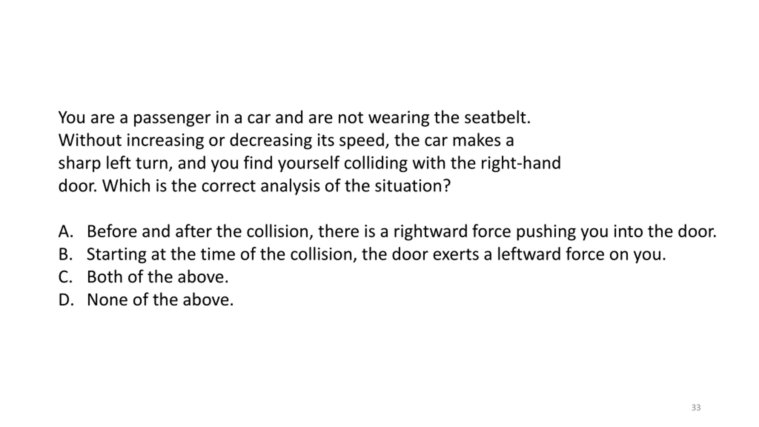 You are a passenger in a car and are not wearing the seatbelt. Without increasing or decreasing its speed, the car makes a sharp left turn, and you find yourself colliding with the right-hand door. Which is the correct analysis of the situation? A. Before and after the collision, there is a rightward force pushing you into the door. B. Starting at the time of the collision, the door exerts a leftward force on you. C. Both of the above. D. None of the above. 33