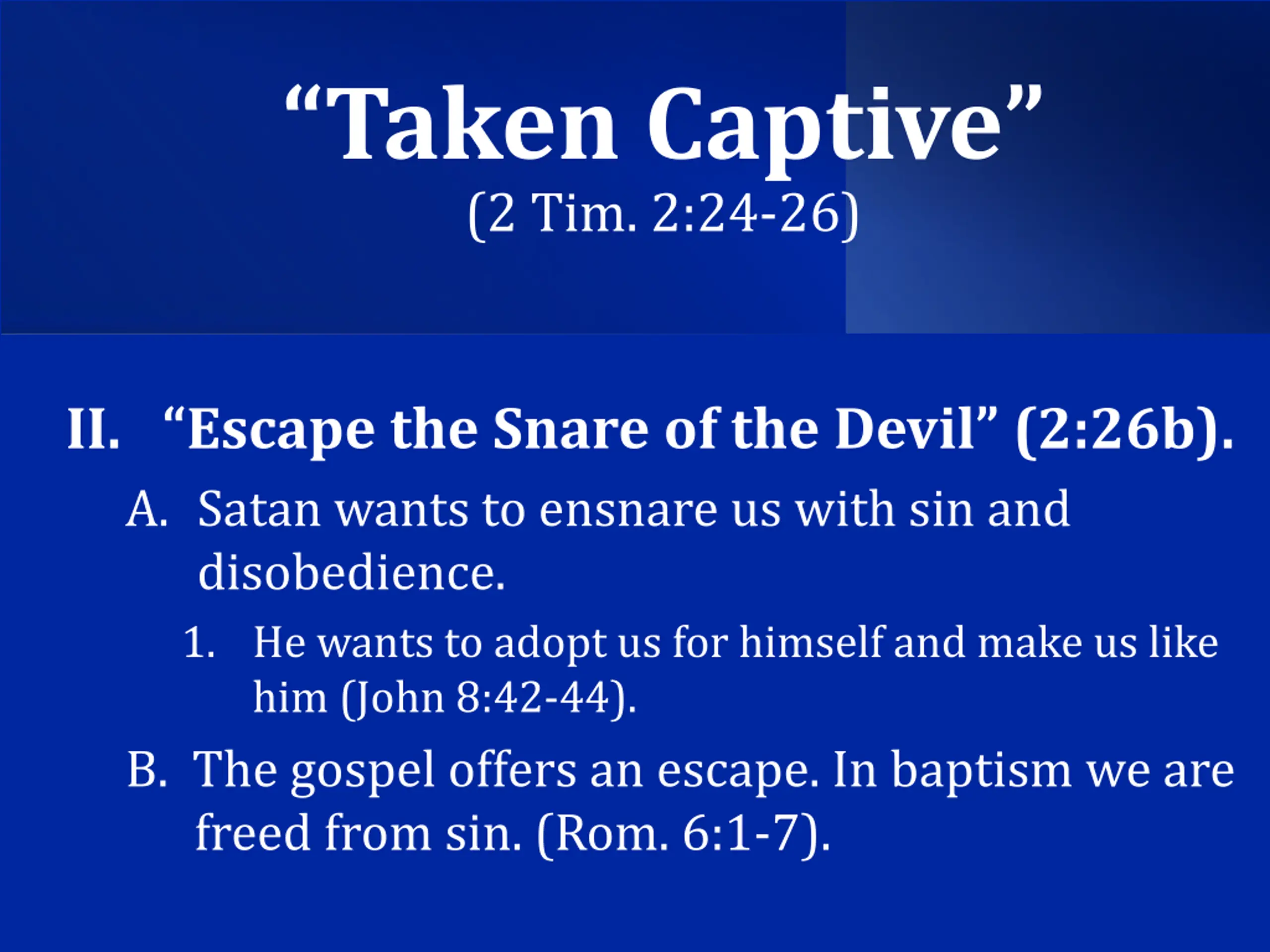 Taken Captive (2 Tim. 2:24-26) II. Escape the Snare of the Devil (2:26b). A. Satan wants to ensnare us with sin and disobedience. 1. He wants to adopt us for himself and make us like him (John 8:42-44). B. The gospel offers an escape. In baptism we are freed from sin. (Rom. 6:1-7).