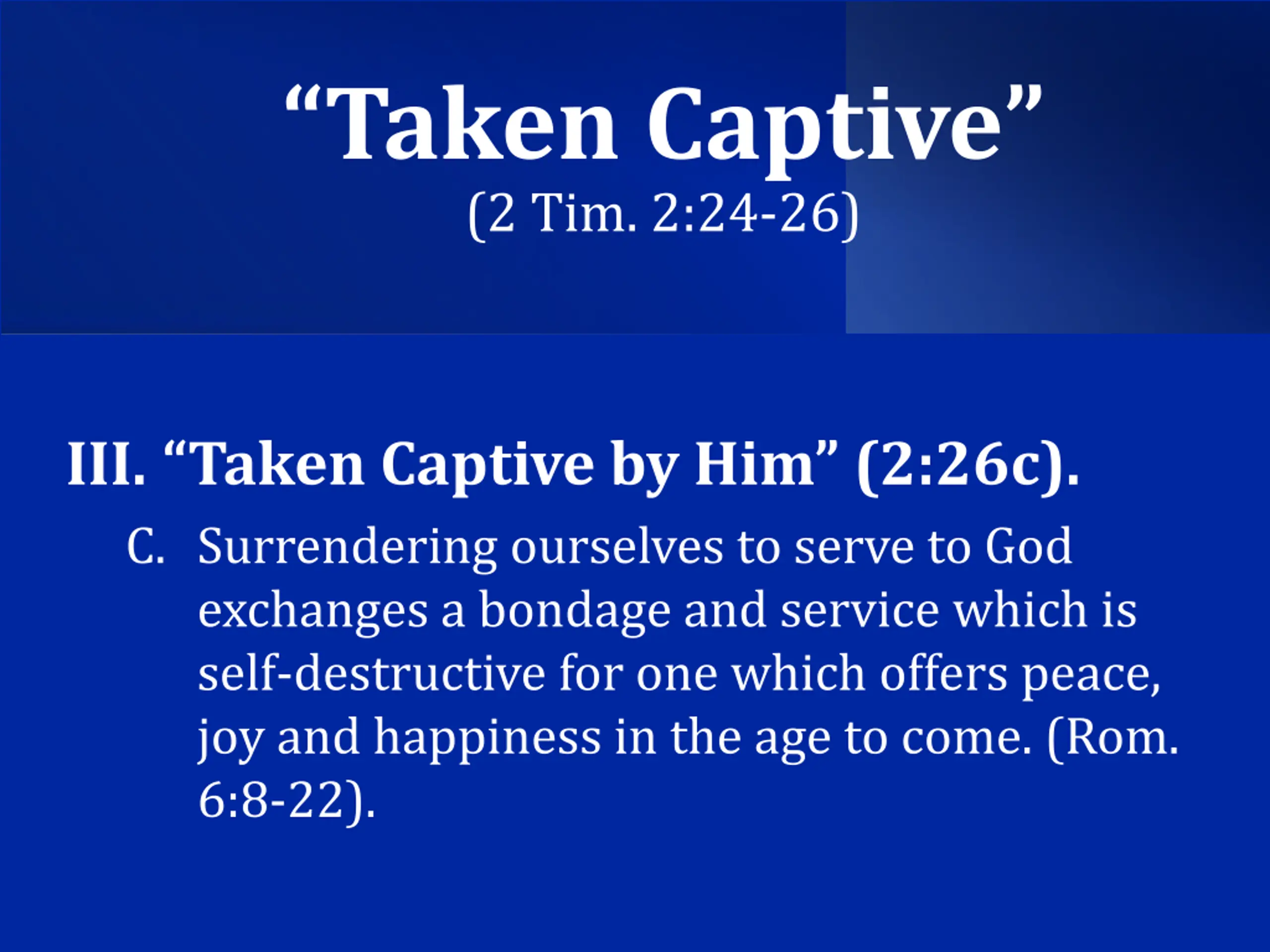 Taken Captive (2 Tim. 2:24-26) III. Taken Captive by Him (2:26c). C. Surrendering ourselves to serve to God exchanges a bondage and service which is self-destructive for one which offers peace, joy and happiness in the age to come. (Rom. 6:8-22).