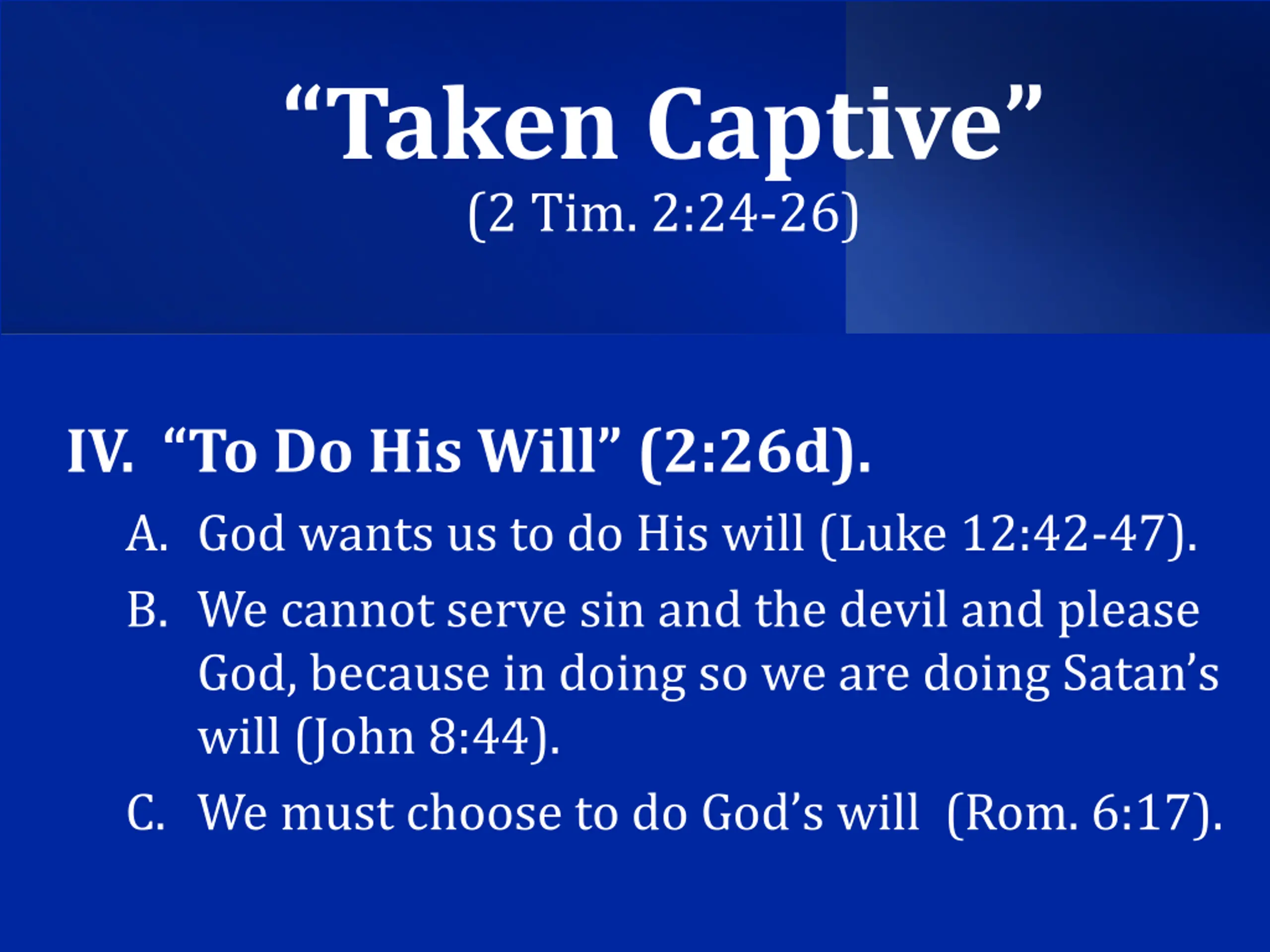 Taken Captive (2 Tim. 2:24-26) IV. To Do His Will (2:26d). A. God wants us to do His will (Luke 12:42-47). B. We cannot serve sin and the devil and please God, because in doing so we are doing Satan s will (John 8:44). C. We must choose to do God s will (Rom. 6:17).