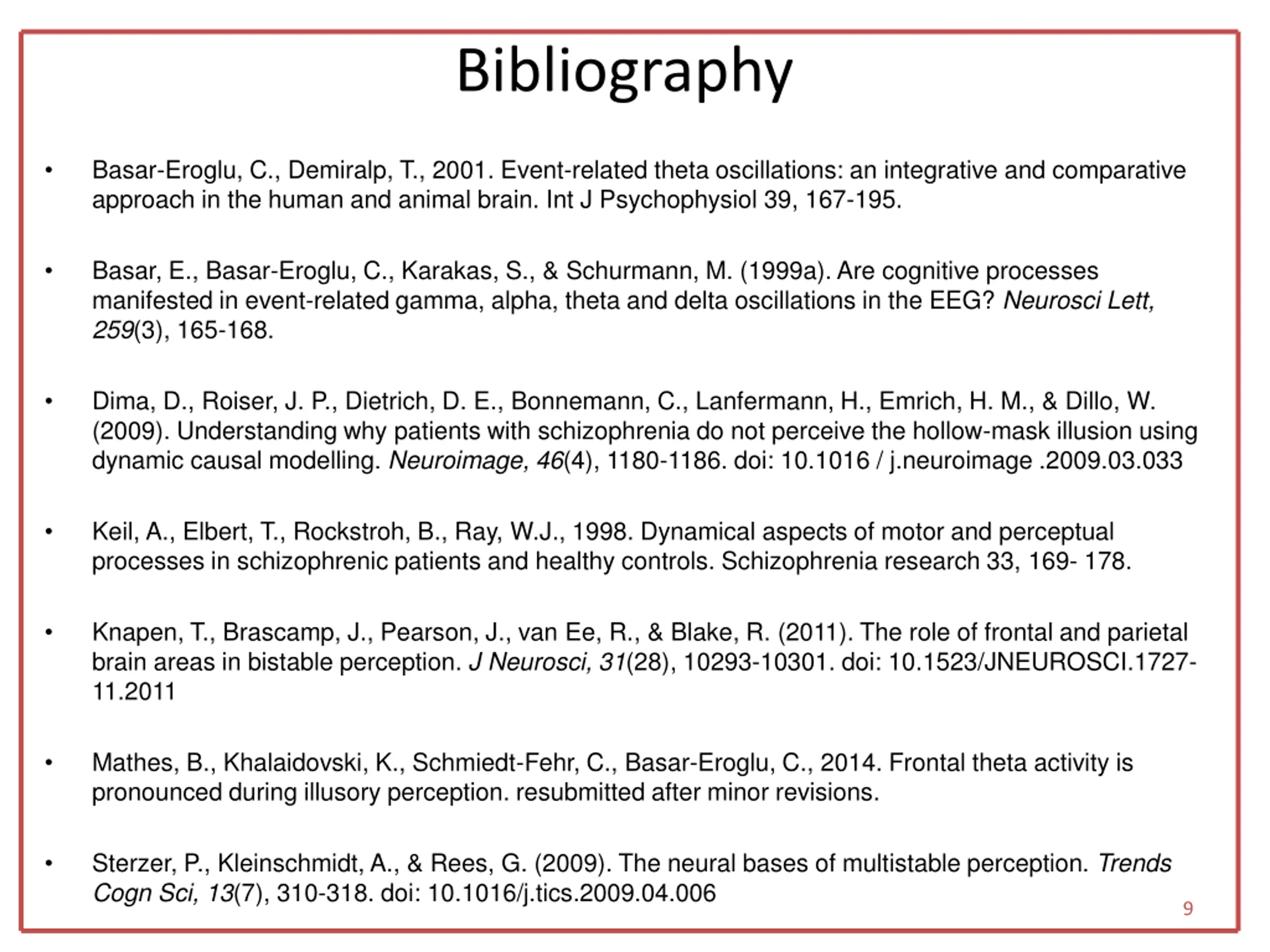 Bibliography Basar-Eroglu, C., Demiralp, T., 2001. Event-related theta oscillations: an integrative and comparative approach in the human and animal brain. Int J Psychophysiol 39, 167-195. Basar, E., Basar-Eroglu, C., Karakas, S., & Schurmann, M. (1999a). Are cognitive processes manifested in event-related gamma, alpha, theta and delta oscillations in the EEG? Neurosci Lett, 259(3), 165-168. Dima, D., Roiser, J. P., Dietrich, D. E., Bonnemann, C., Lanfermann, H., Emrich, H. M., & Dillo, W. (2009). Understanding why patients with schizophrenia do not perceive the hollow-mask illusion using dynamic causal modelling. Neuroimage, 46(4), 1180-1186. doi: 10.1016 / j.neuroimage .2009.03.033 Keil, A., Elbert, T., Rockstroh, B., Ray, W.J., 1998. Dynamical aspects of motor and perceptual processes in schizophrenic patients and healthy controls. Schizophrenia research 33, 169- 178. Knapen, T., Brascamp, J., Pearson, J., van Ee, R., & Blake, R. (2011). The role of frontal and parietal brain areas in bistable perception. J Neurosci, 31(28), 10293-10301. doi: 10.1523/JNEUROSCI.1727- 11.2011 Mathes, B., Khalaidovski, K., Schmiedt-Fehr, C., Basar-Eroglu, C., 2014. Frontal theta activity is pronounced during illusory perception. resubmitted after minor revisions. Sterzer, P., Kleinschmidt, A., & Rees, G. (2009). The neural bases of multistable perception. Trends Cogn Sci, 13(7), 310-318. doi: 10.1016/j.tics.2009.04.006 9