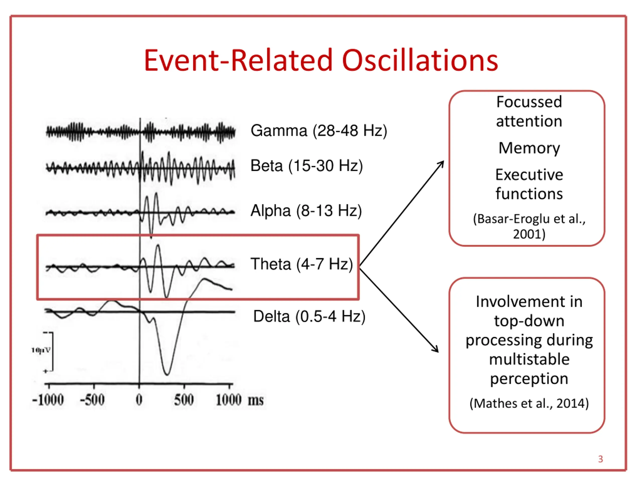 Event-Related Oscillations Focussed attention Memory Executive functions Gamma (28-48 Hz) Beta (15-30 Hz) Alpha (8-13 Hz) (Basar-Eroglu et al., 2001) Theta (4-7 Hz) Involvement in top-down processing during multistable perception Delta (0.5-4 Hz) (Mathes et al., 2014) 3
