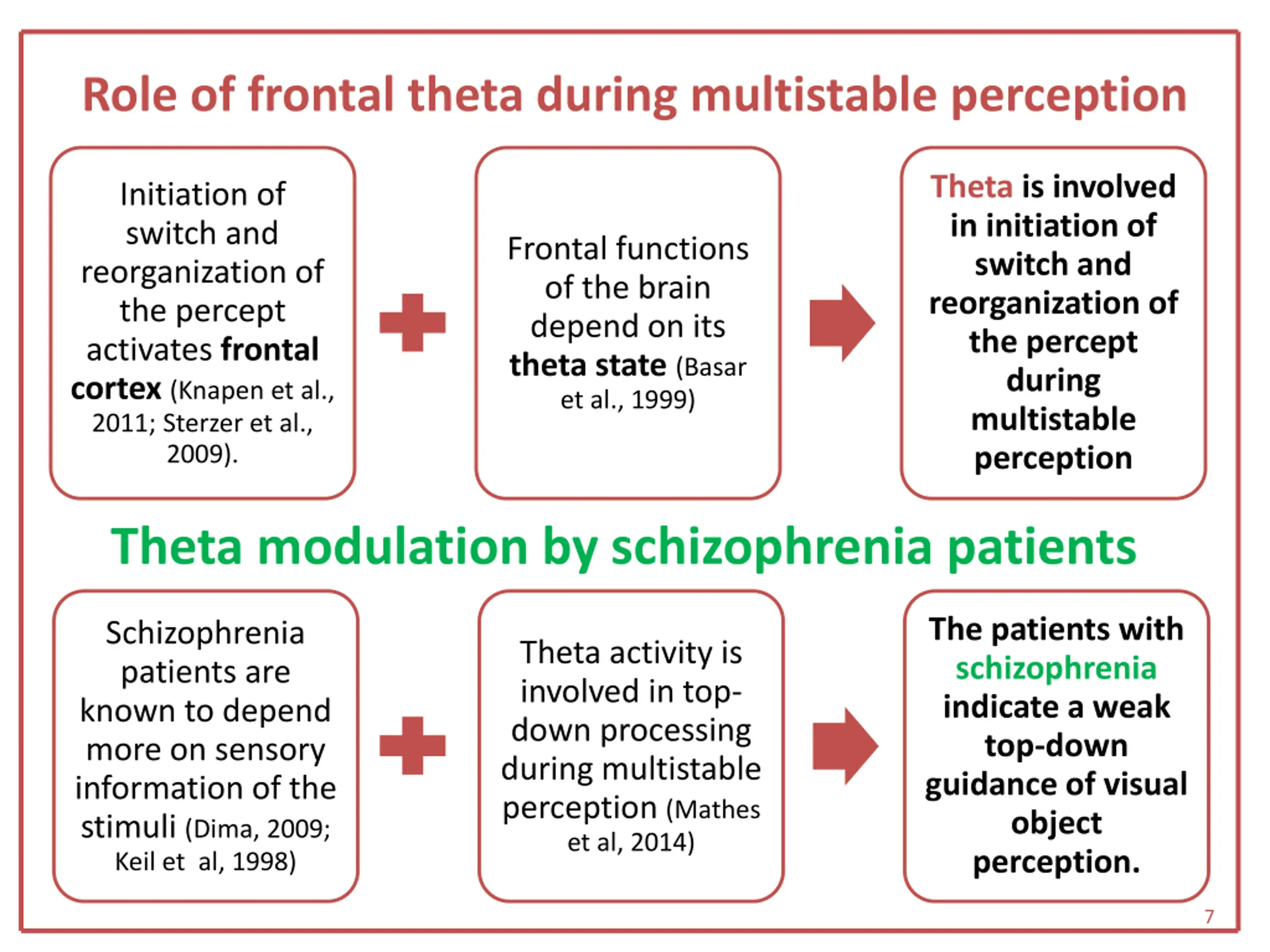 Role of frontal theta during multistable perception Theta is involved in initiation of switch and reorganization of the percept during multistable perception Initiation of switch and reorganization of the percept activates frontal cortex (Knapen et al., 2011; Sterzer et al., 2009). Frontal functions of the brain depend on its theta state (Basar et al., 1999) Theta modulation by schizophrenia patients The patients with schizophrenia indicate a weak top-down guidance of visual object perception. Schizophrenia patients are known to depend more on sensory informationof the stimuli (Dima, 2009; Keil et al, 1998) Theta activity is involved in top- down processing during multistable perception (Mathes et al, 2014) 7