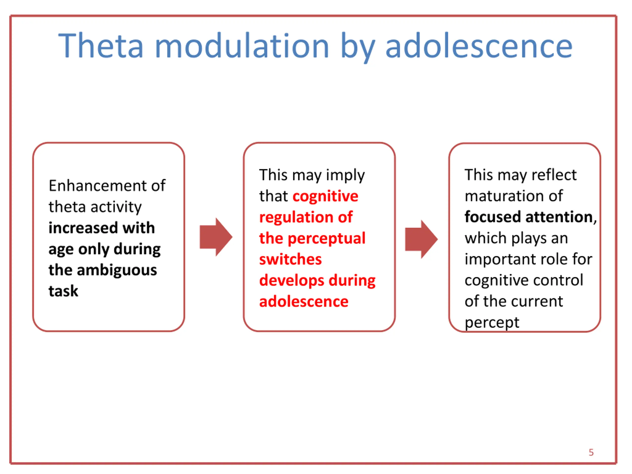 Theta modulation by adolescence This may reflect maturation of focused attention, which plays an important role for cognitive control of the current percept This may imply that cognitive regulation of the perceptual switches develops during adolescence Enhancement of theta activity increased with age only during the ambiguous task 5
