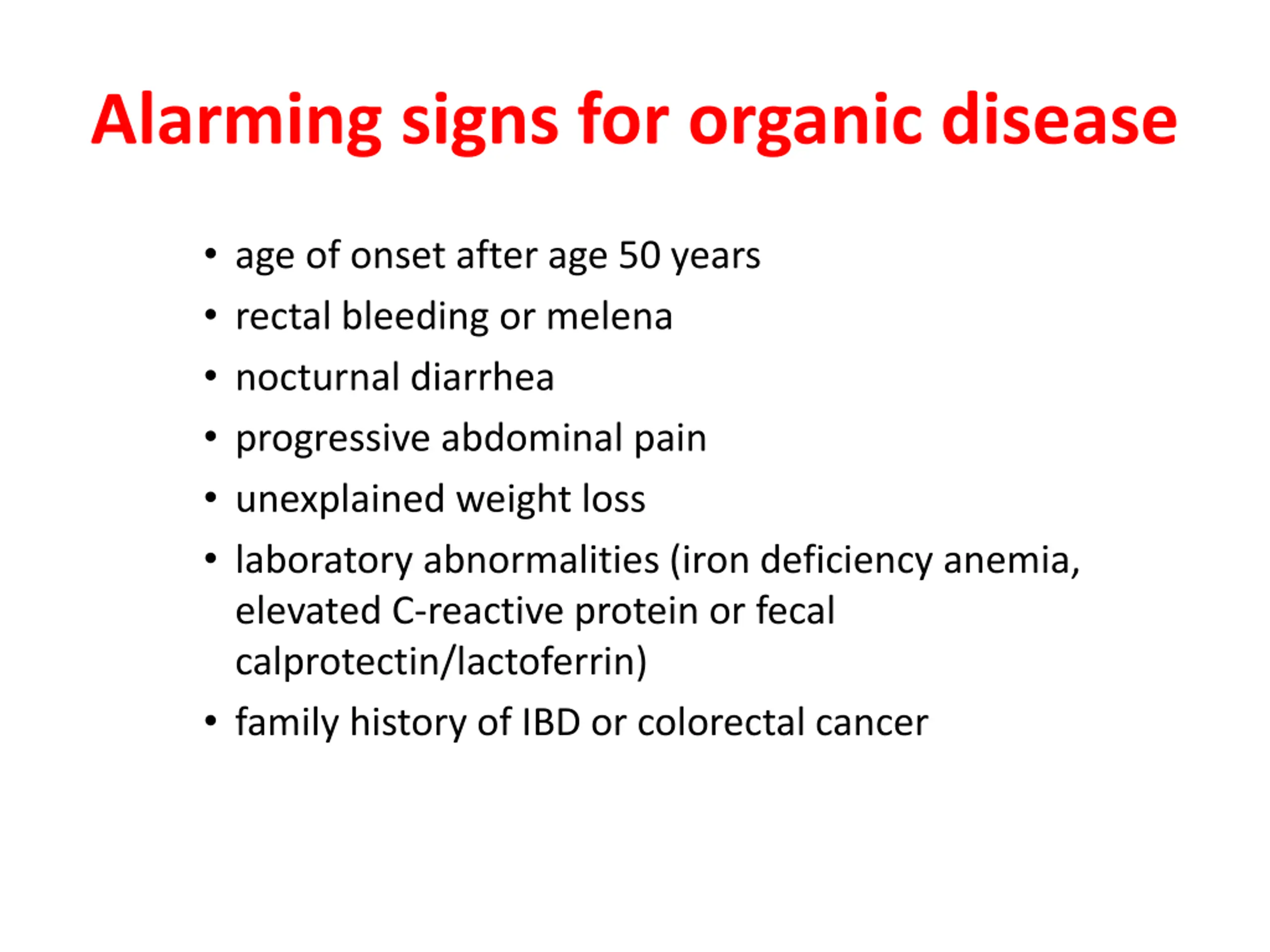 Alarming signs for organic disease age of onset after age 50 years rectal bleeding or melena nocturnal diarrhea progressive abdominal pain unexplained weight loss laboratory abnormalities (iron deficiency anemia, elevated C-reactive protein or fecal calprotectin/lactoferrin) family history of IBD or colorectal cancer