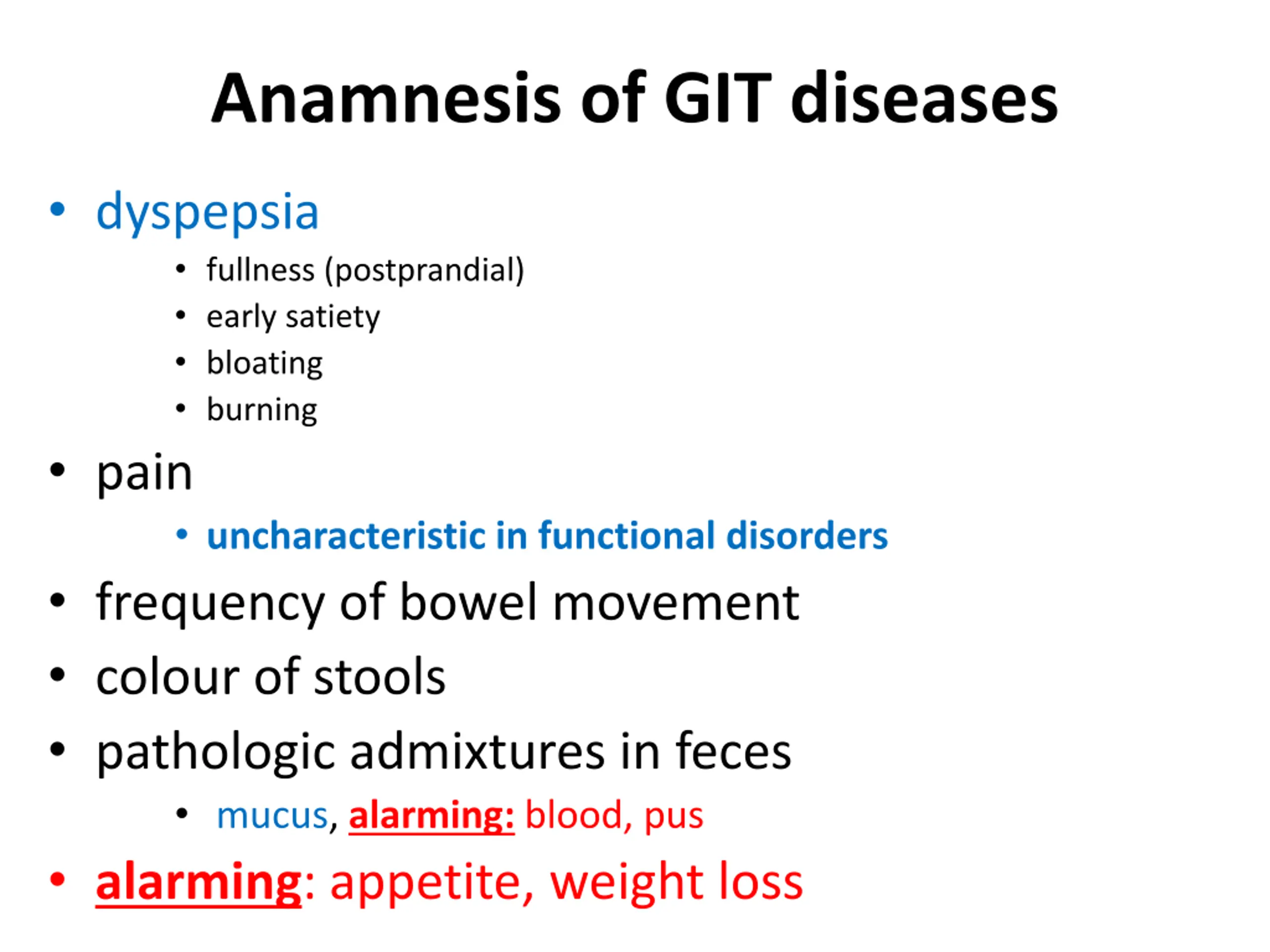 Anamnesis of GIT diseases dyspepsia fullness (postprandial) early satiety bloating burning pain uncharacteristic in functional disorders frequency of bowel movement colour of stools pathologic admixtures in feces mucus, alarming: blood, pus alarming: appetite, weight loss