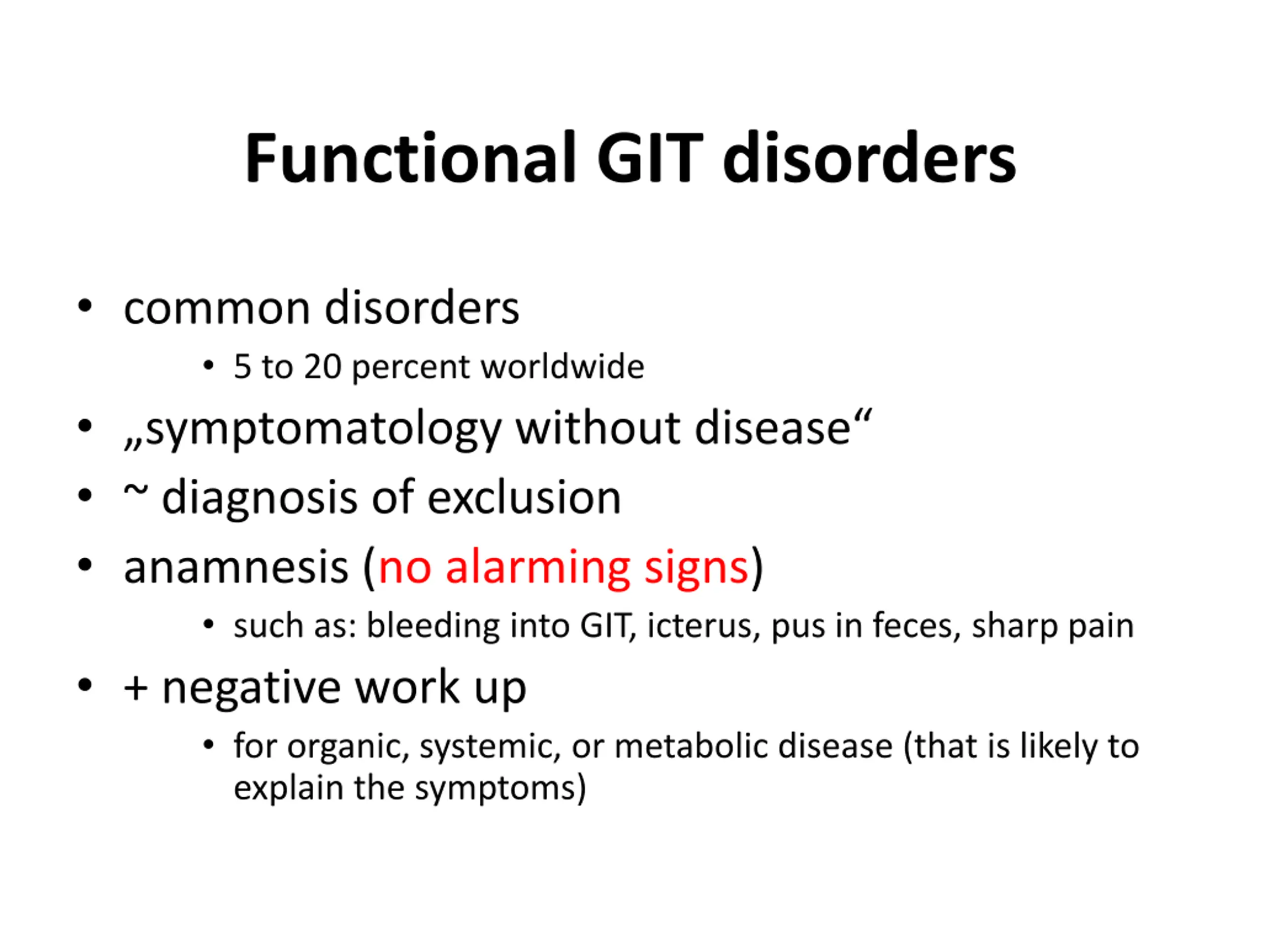 Functional GIT disorders common disorders 5 to 20 percent worldwide symptomatology without disease ~ diagnosis of exclusion anamnesis (no alarming signs) such as: bleeding into GIT, icterus, pus in feces, sharp pain + negative work up for organic, systemic, or metabolic disease (that is likely to explain the symptoms)