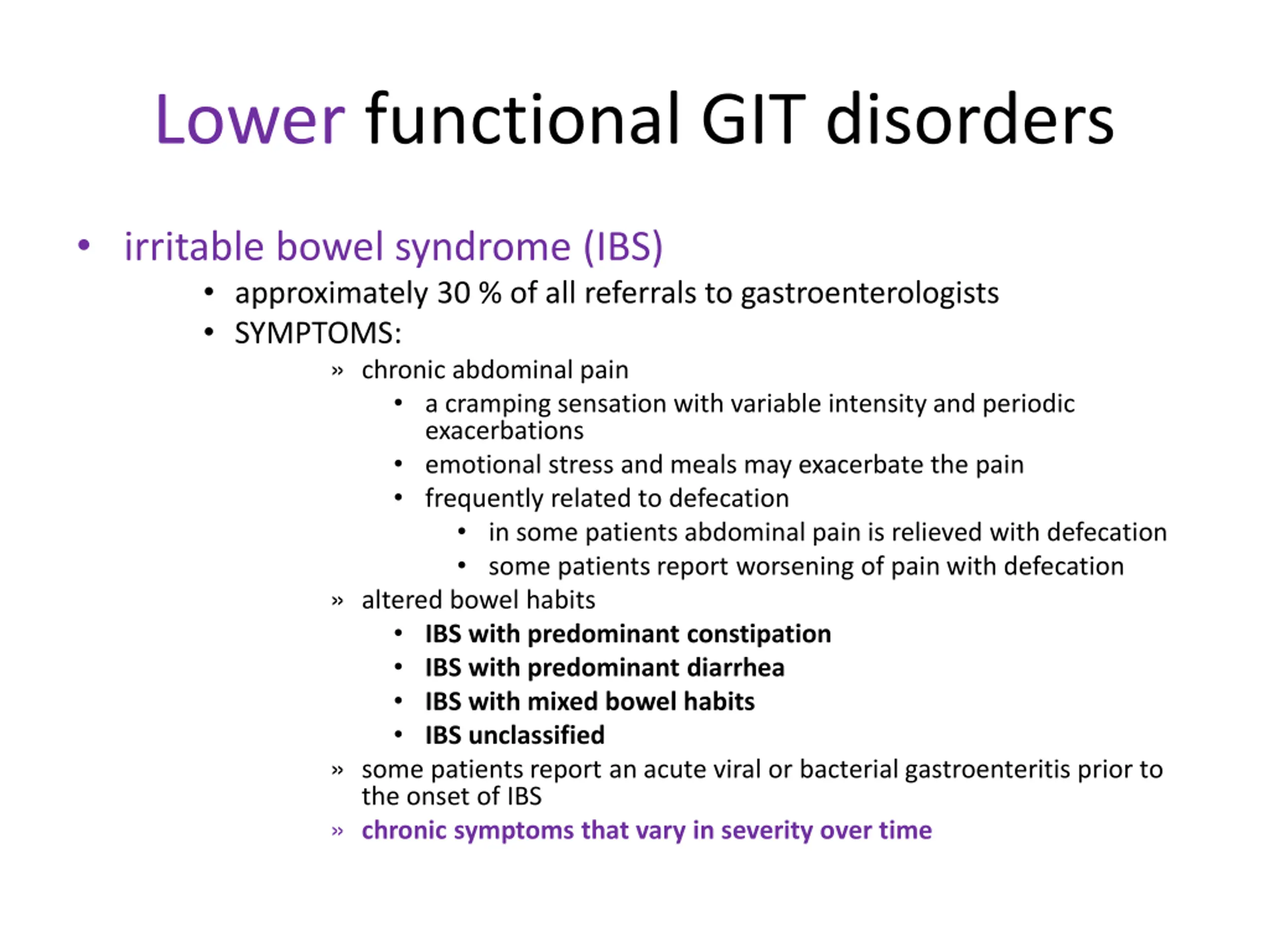 Lower functional GIT disorders irritable bowel syndrome (IBS) approximately 30 % of all referrals to gastroenterologists SYMPTOMS: chronic abdominal pain a cramping sensation with variable intensity and periodic exacerbations emotional stress and meals may exacerbate the pain frequently related to defecation in some patients abdominal pain is relieved with defecation some patients report worsening of pain with defecation altered bowel habits IBS with predominant constipation IBS with predominant diarrhea IBS with mixed bowel habits IBS unclassified some patients report an acute viral or bacterial gastroenteritis prior to the onset of IBS chronic symptoms that vary in severity over time