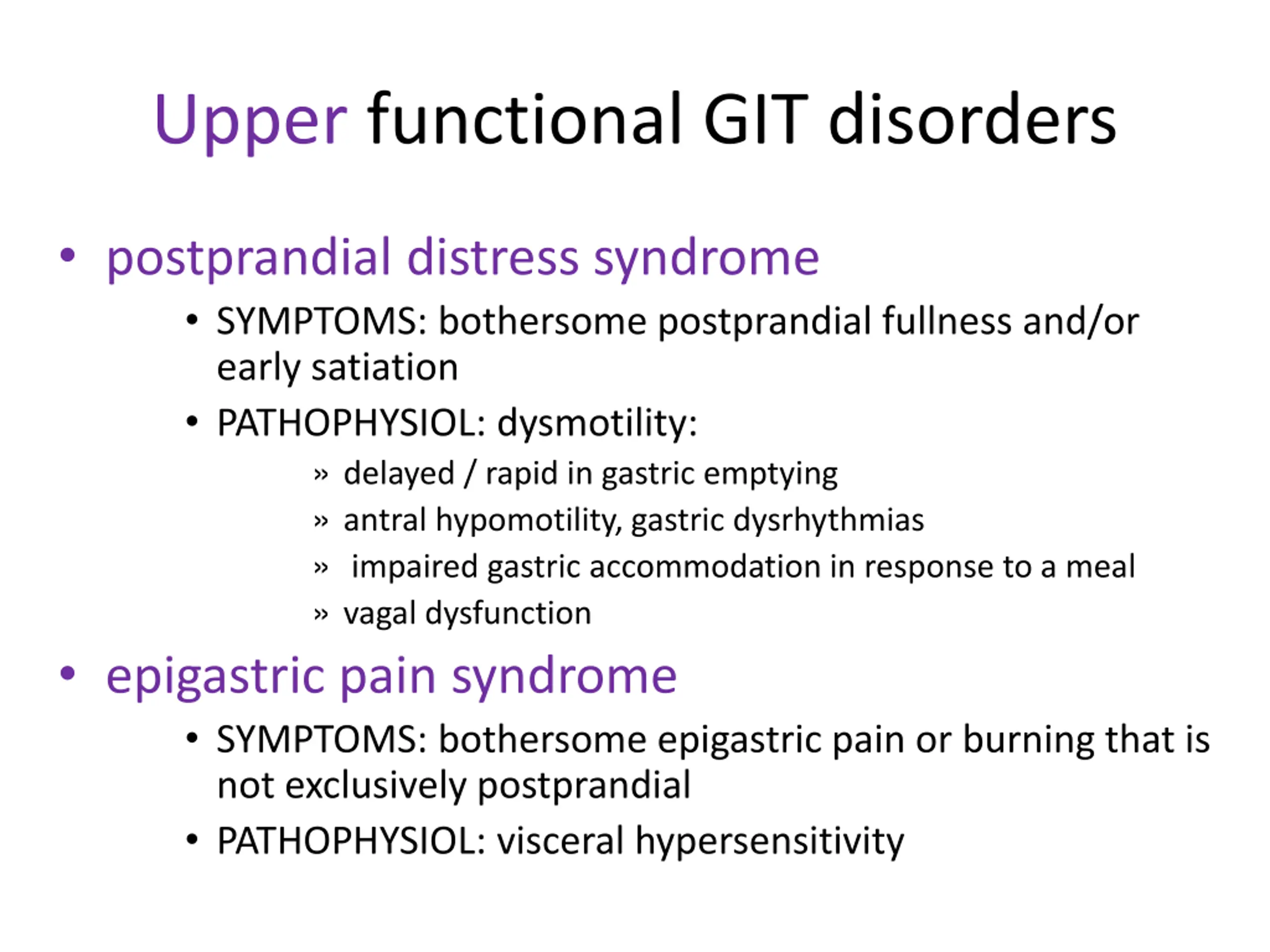 Upper functional GIT disorders postprandial distress syndrome SYMPTOMS: bothersome postprandial fullness and/or early satiation PATHOPHYSIOL: dysmotility: delayed / rapid in gastric emptying antral hypomotility, gastric dysrhythmias impaired gastric accommodation in response to a meal vagal dysfunction epigastric pain syndrome SYMPTOMS: bothersome epigastric pain or burning that is not exclusively postprandial PATHOPHYSIOL: visceral hypersensitivity