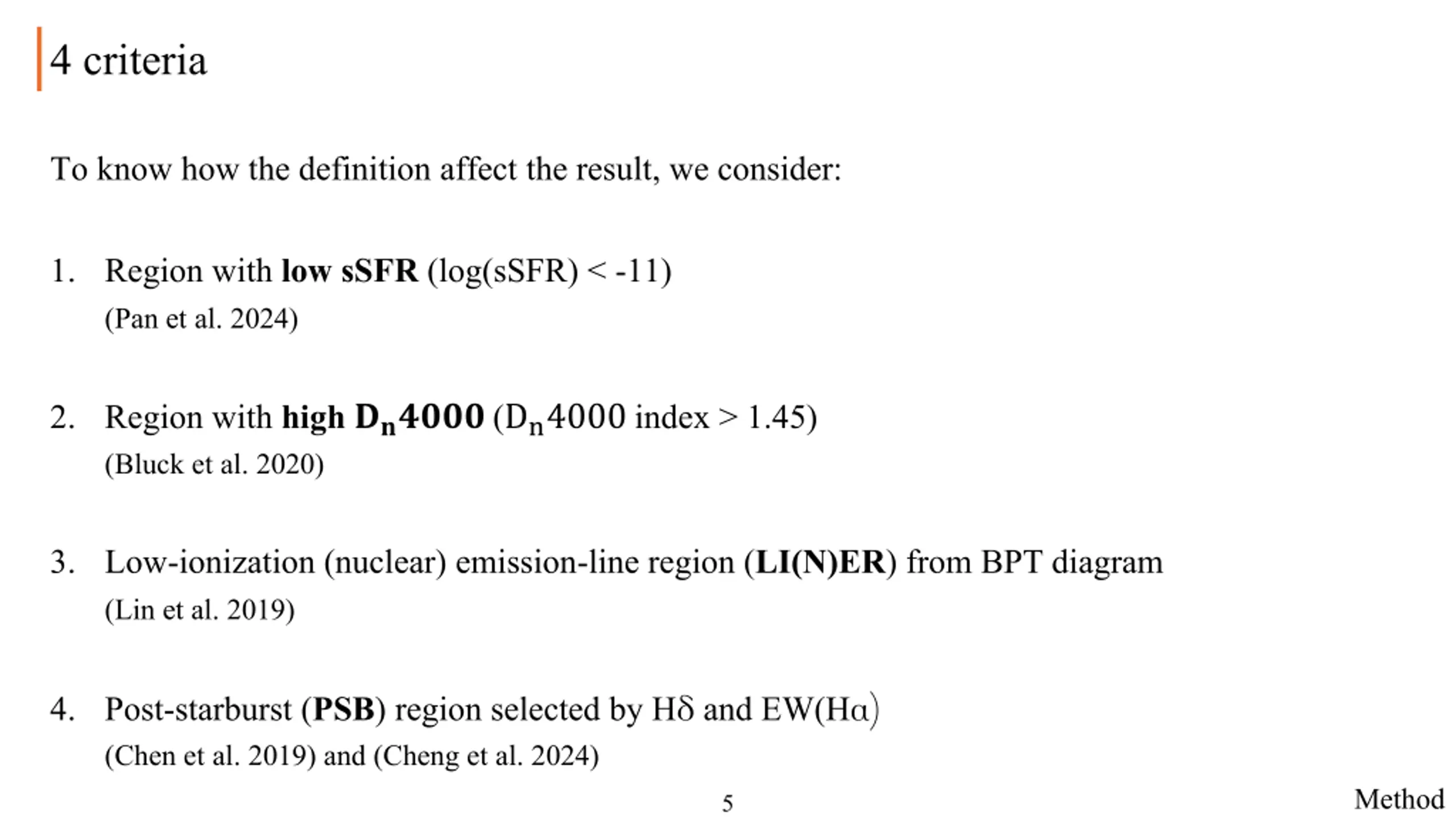 4 criteria To know how the definition affect the result, we consider: 1. Region with low sSFR (log(sSFR) < -11) (Pan et al. 2024) 2. Region with high ??????(Dn4000index > 1.45) (Bluck et al. 2020) 3. Low-ionization (nuclear) emission-line region (LI(N)ER) from BPT diagram (Lin et al. 2019) 4. Post-starburst (PSB) region selected by H and EW(H ) (Chen et al. 2019) and (Cheng et al. 2024) Method 5
