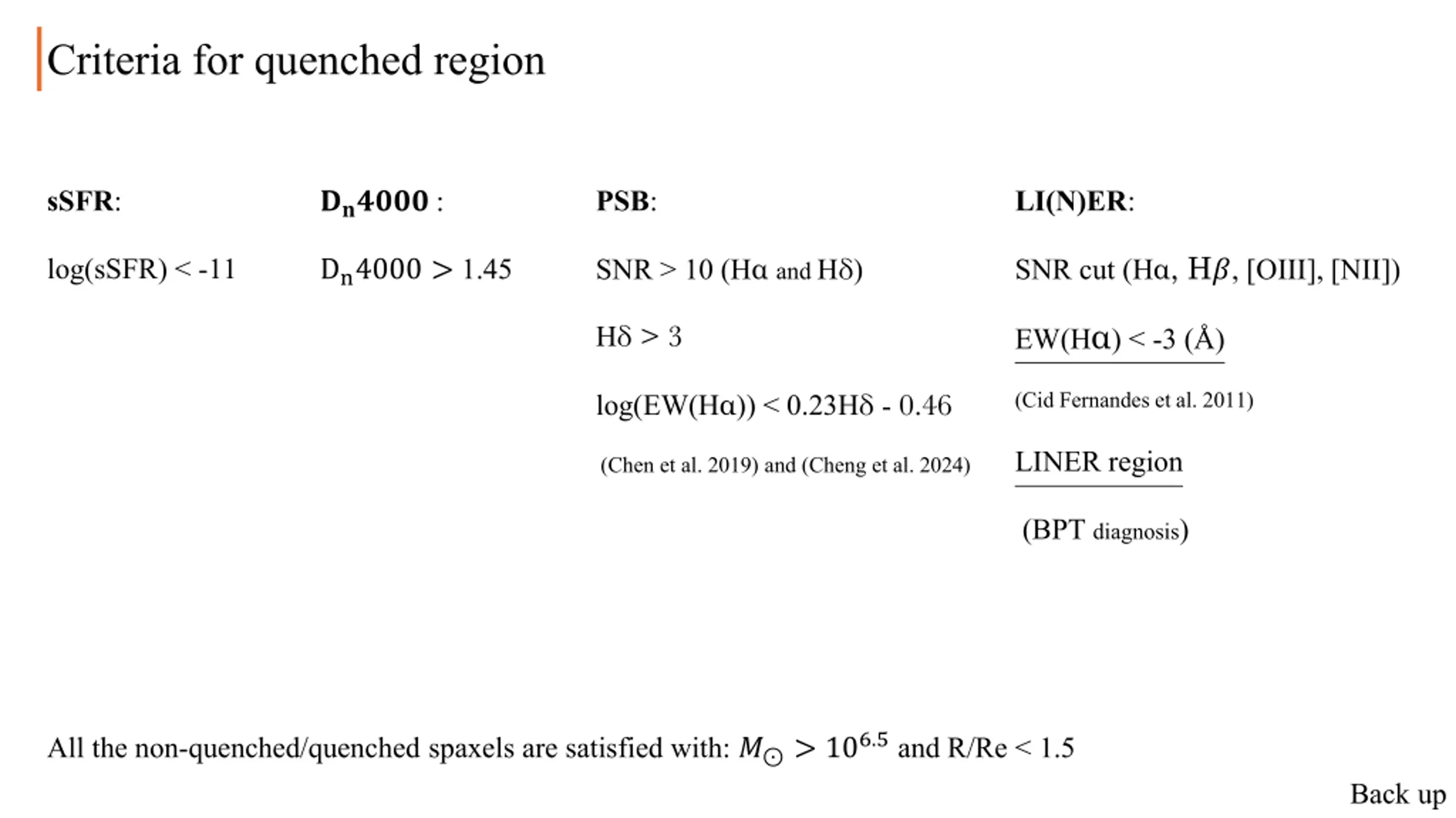 Criteria for quenched region sSFR: PSB: LI(N)ER: ?????? : SNR > 10 (H and H ) SNR cut (H , H?, [OIII], [NII]) log(sSFR) < -11 Dn4000 > 1.45 EW(H ) < -3 ( ) H > 3 log(EW(H )) < 0.23H - 0.46 (Cid Fernandes et al. 2011) LINER region (Chen et al. 2019) and (Cheng et al. 2024) (BPT diagnosis) All the non-quenched/quenched spaxels are satisfied with: ? > 106.5 and R/Re < 1.5 Back up