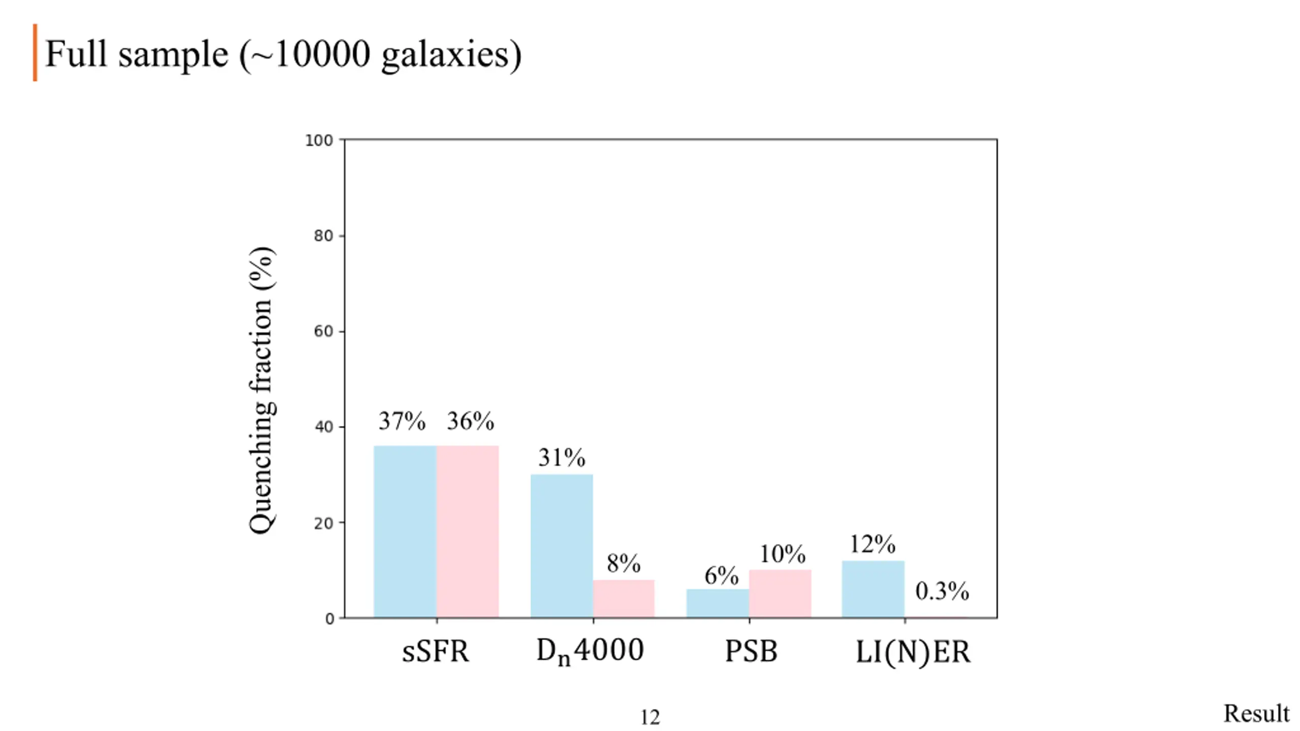 Full sample (~10000 galaxies) Quenching fraction (%) 37% 36% 31% 12% 6%10% 8% 0.3% Dn4000 sSFR PSB LI(N)ER Result 12