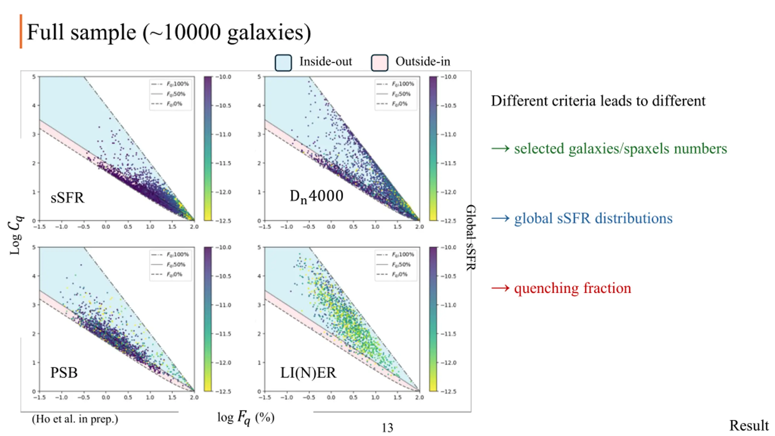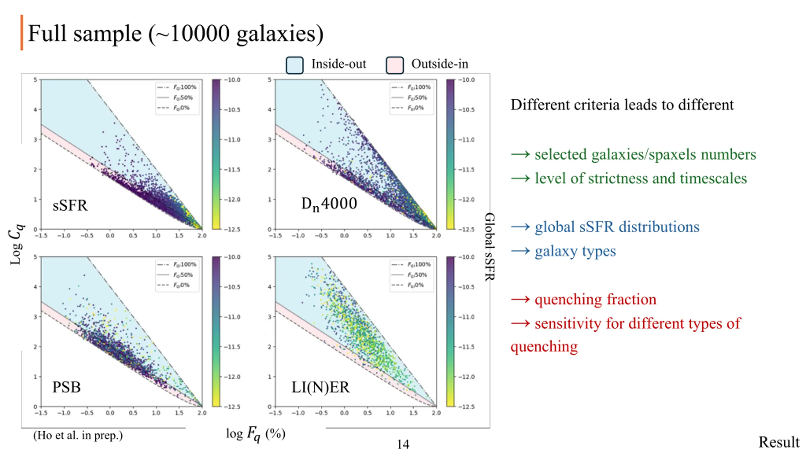 Full sample (~10000 galaxies) Inside-out Outside-in Different criteria leads to different selected galaxies/spaxels numbers sSFR Dn4000 Global sSFR global sSFR distributions Log ?? quenching fraction PSB LI(N)ER log ?? (%) (Ho et al. in prep.) Result 13