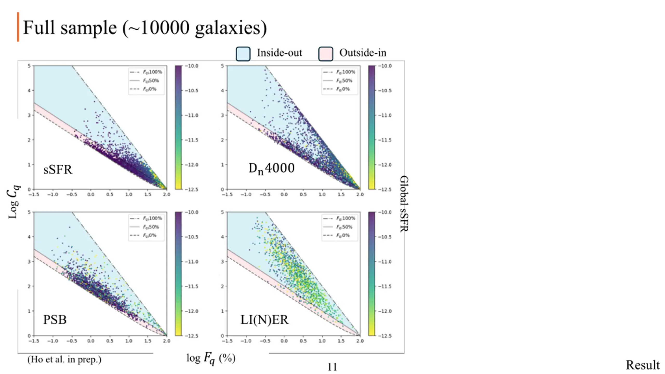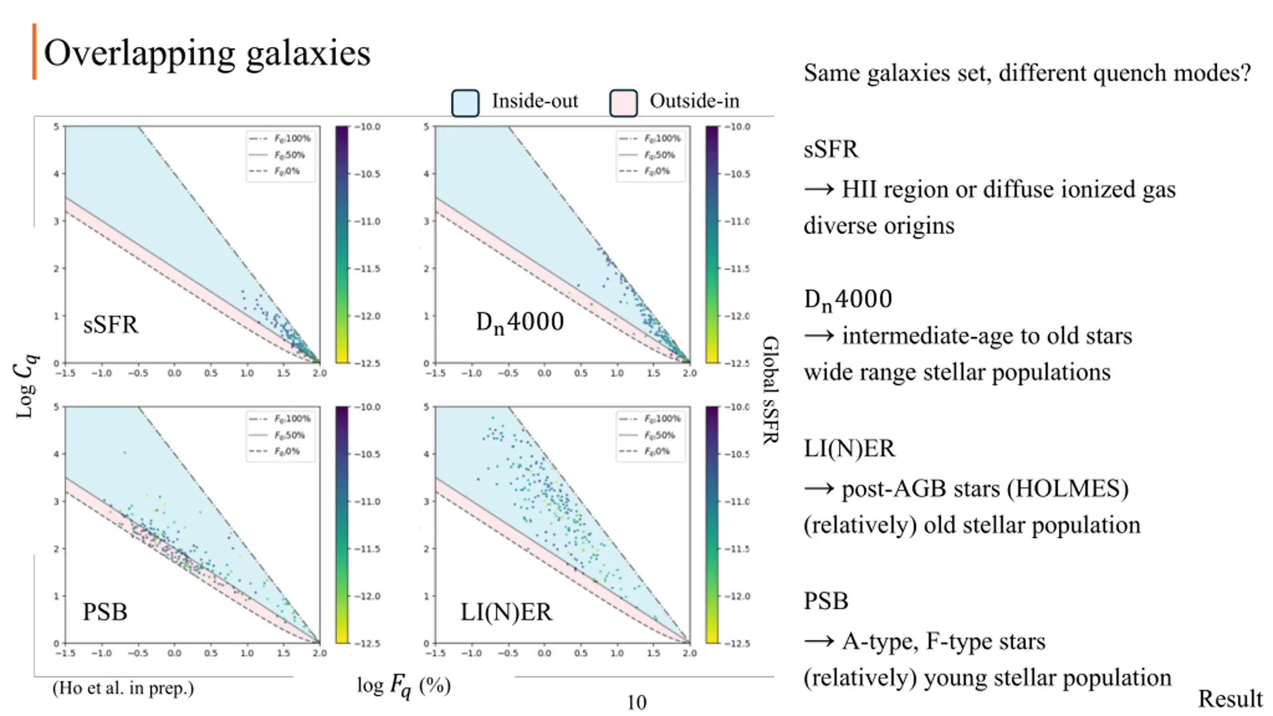 Overlapping galaxies Same galaxies set, different quench modes? Inside-out Outside-in sSFR HII region or diffuse ionized gas diverse origins Dn4000 intermediate-age to old stars wide range stellar populations sSFR Dn4000 Global sSFR Log ?? LI(N)ER post-AGB stars (HOLMES) (relatively) old stellar population PSB A-type, F-type stars (relatively) young stellar population PSB LI(N)ER log ?? (%) (Ho et al. in prep.) Result 10