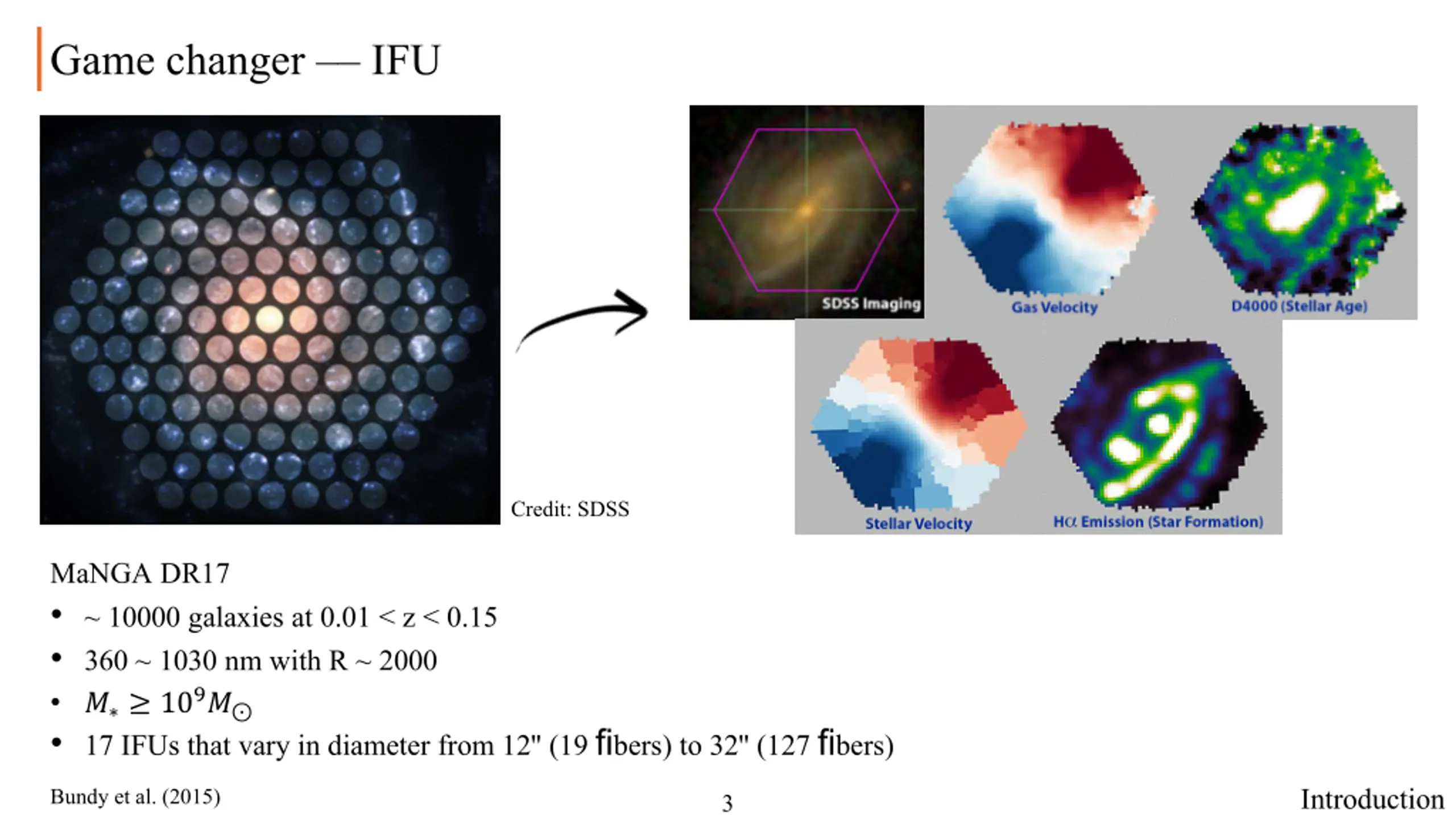 Game changer IFU Credit: SDSS MaNGA DR17 ~ 10000 galaxies at 0.01 < z < 0.15 360 ~ 1030 nm with R ~ 2000 ? 109? 17 IFUs that vary in diameter from 12'' (19 fibers) to 32'' (127 fibers) Bundy et al. (2015) Introduction 3