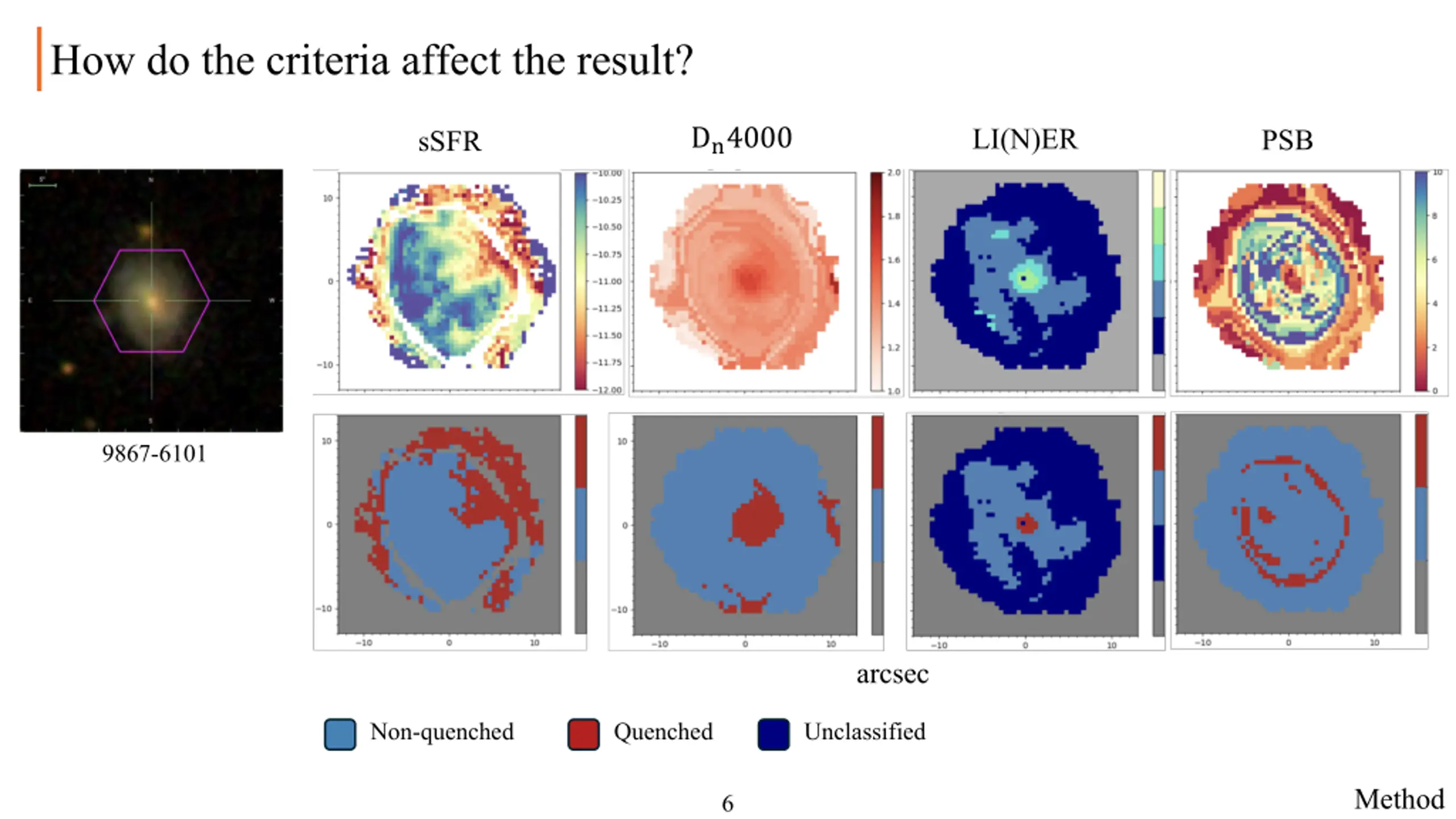 How do the criteria affect the result? LI(N)ER PSB sSFR Dn4000 9867-6101 arcsec Non-quenched Quenched Unclassified Method 6