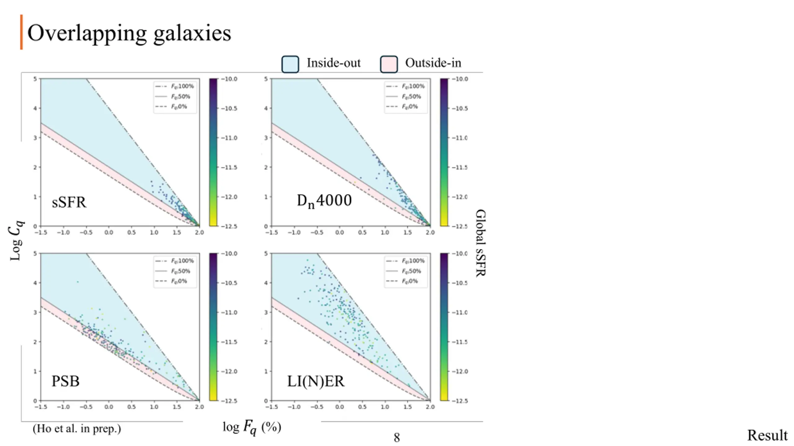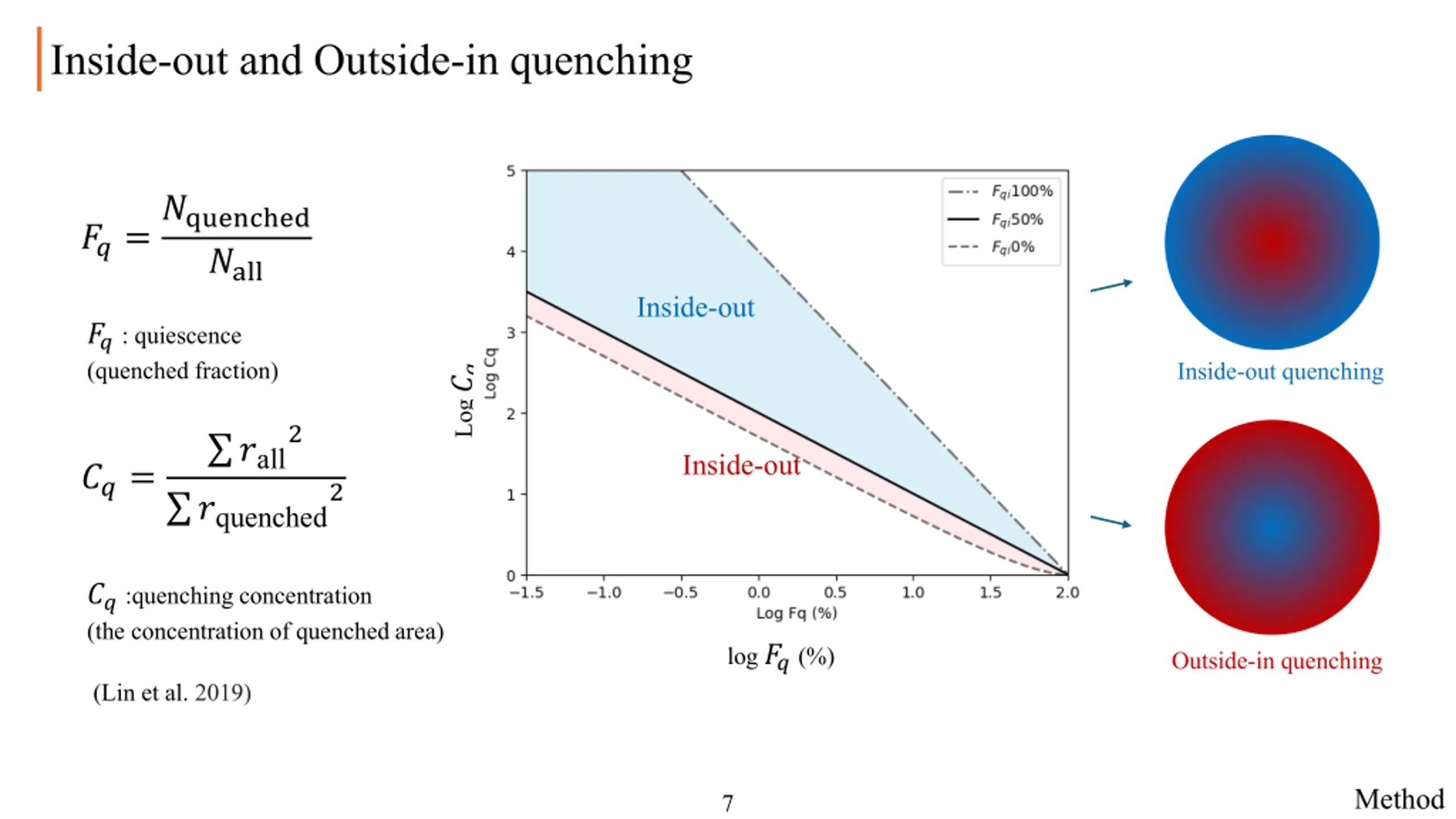 Inside-out and Outside-in quenching ??=?quenched ?all Inside-out ??: quiescence (quenched fraction) Inside-out quenching Log ?? 2 ?all Inside-out ??= 2 ?quenched ??:quenching concentration (the concentration of quenched area) log ?? (%) Outside-in quenching (Lin et al. 2019) Method 7