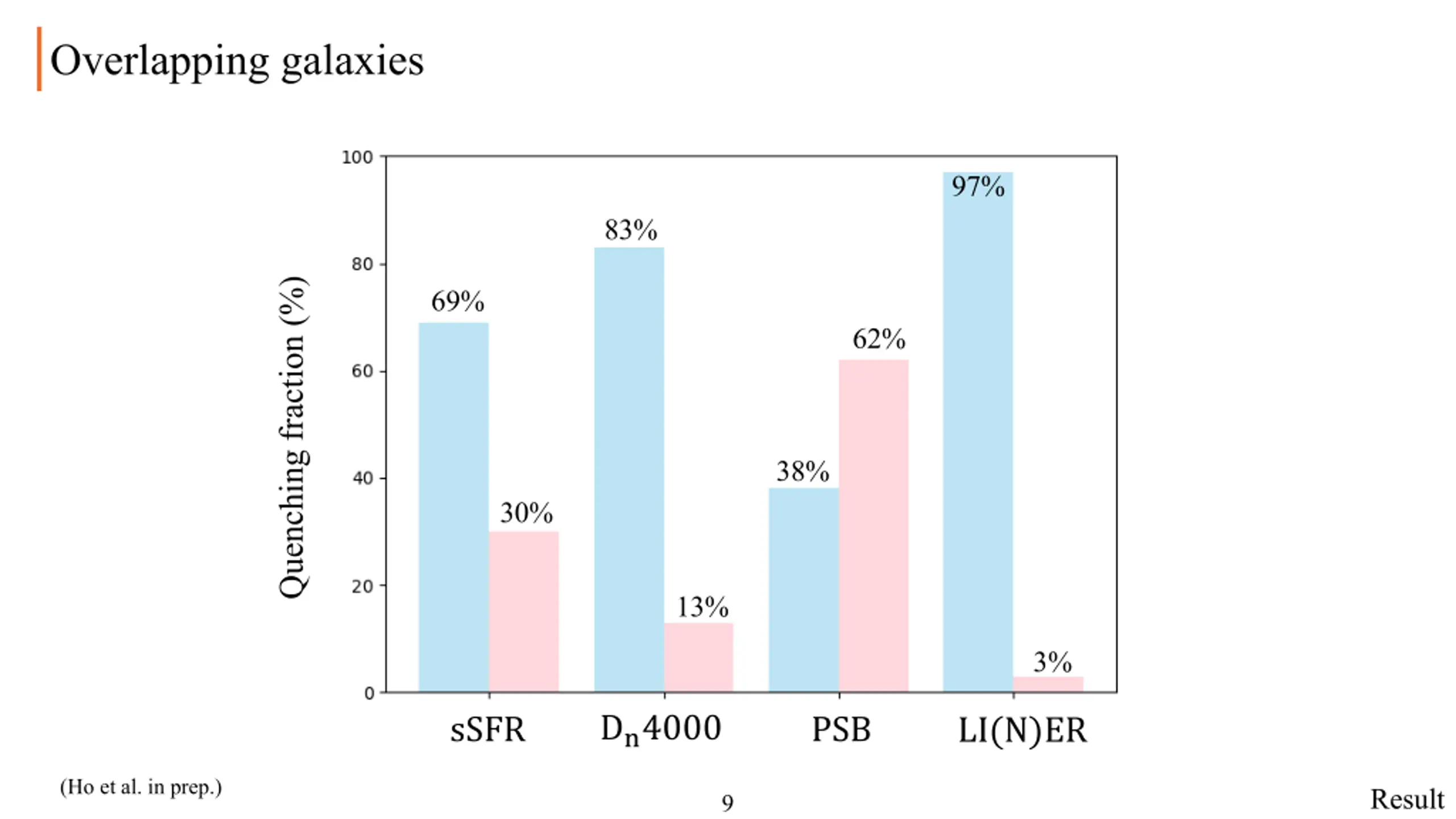 Overlapping galaxies Inside-out Outside-in sSFR Dn4000 Global sSFR Log ?? PSB LI(N)ER log ?? (%) (Ho et al. in prep.) Result 8