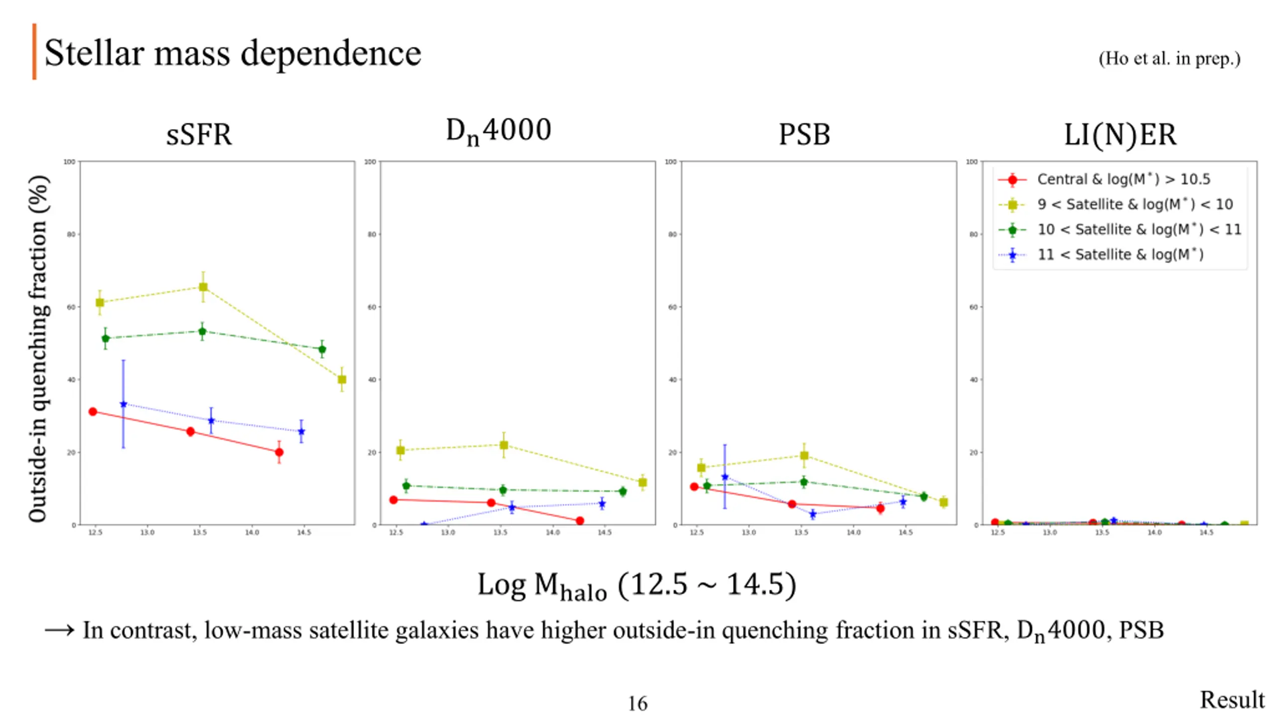 Stellar mass dependence (Ho et al. in prep.) Dn4000 sSFR PSB LI(N)ER Log Mhalo (12.5 ~ 14.5) Central and high-mass satellite galaxies have higher inside-out quenching fraction in sSFR, Dn4000, LI(N)ER Result 15