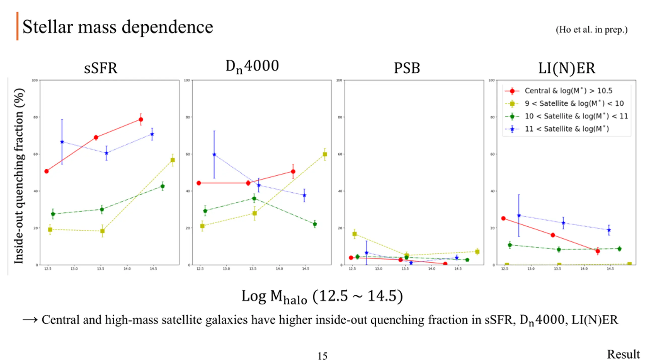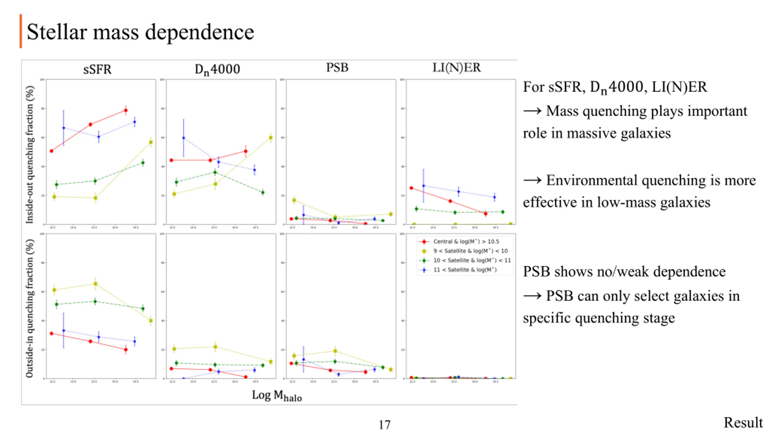 Stellar mass dependence (Ho et al. in prep.) Dn4000 sSFR PSB LI(N)ER Log Mhalo (12.5 ~ 14.5) In contrast, low-mass satellite galaxies have higher outside-in quenching fraction in sSFR, Dn4000, PSB Result 16