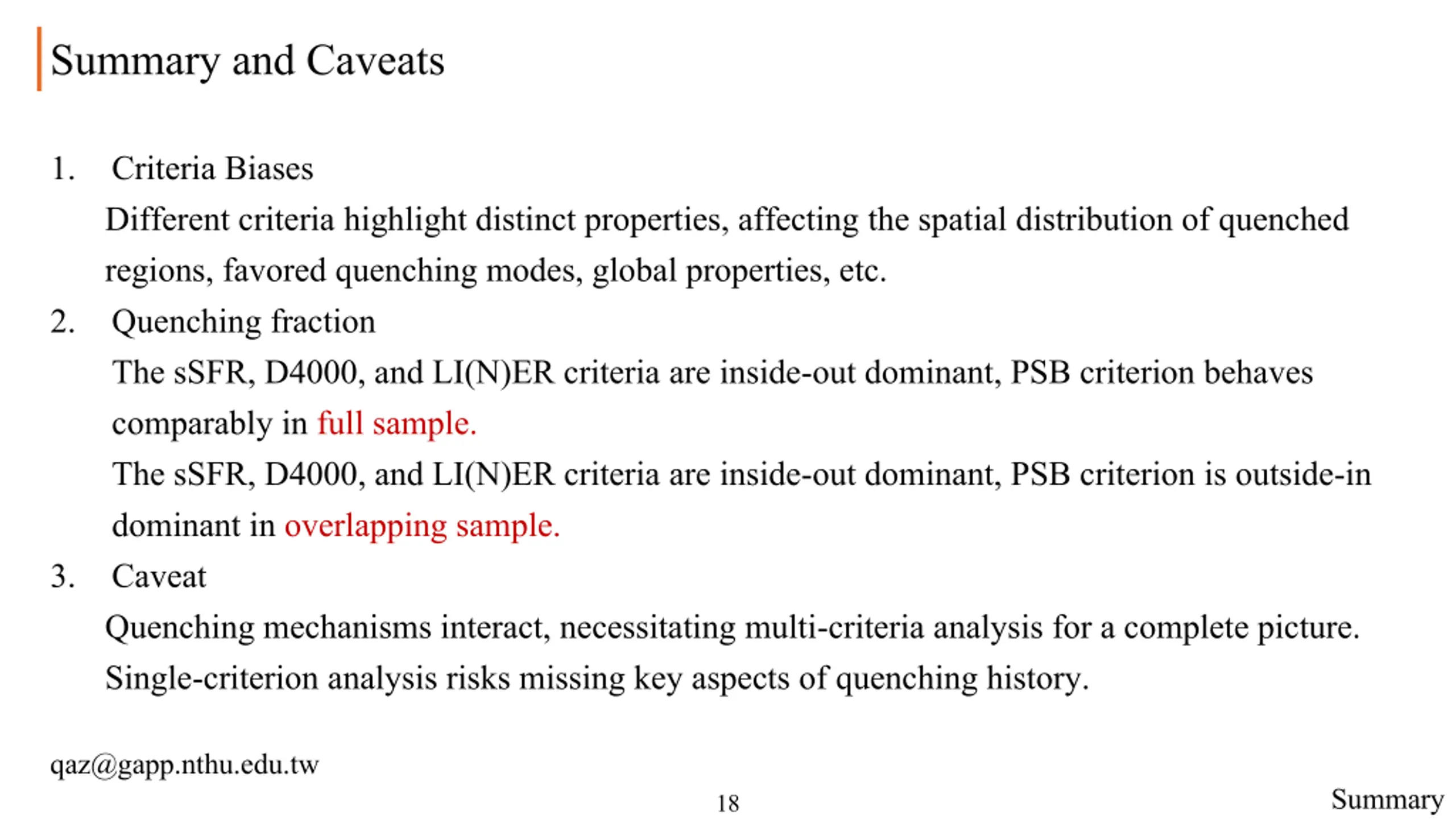 Summary and Caveats 1. Criteria Biases Different criteria highlight distinct properties, affecting the spatial distribution of quenched regions, favored quenching modes, global properties, etc. 2. Quenching fraction The sSFR, D4000, and LI(N)ER criteria are inside-out dominant, PSB criterion behaves comparably in full sample. The sSFR, D4000, and LI(N)ER criteria are inside-out dominant, PSB criterion is outside-in dominant in overlapping sample. 3. Caveat Quenching mechanisms interact, necessitating multi-criteria analysis for a complete picture. Single-criterion analysis risks missing key aspects of quenching history. qaz@gapp.nthu.edu.tw Summary 18
