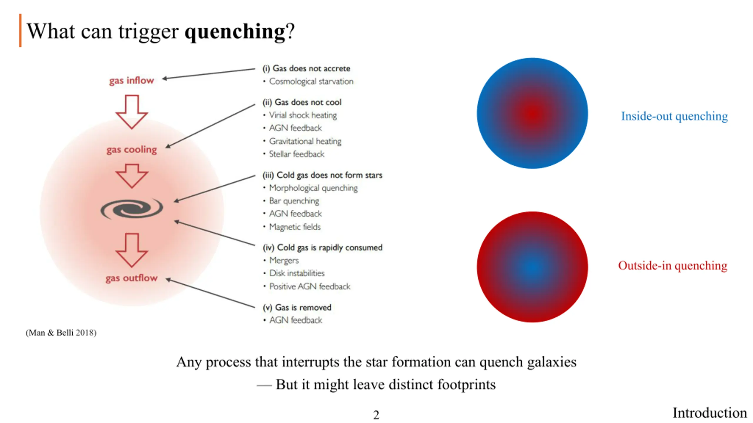 What can trigger quenching? Inside-out quenching Outside-in quenching (Man & Belli2018) Any process that interrupts the star formation can quench galaxies But it might leave distinct footprints Introduction 2
