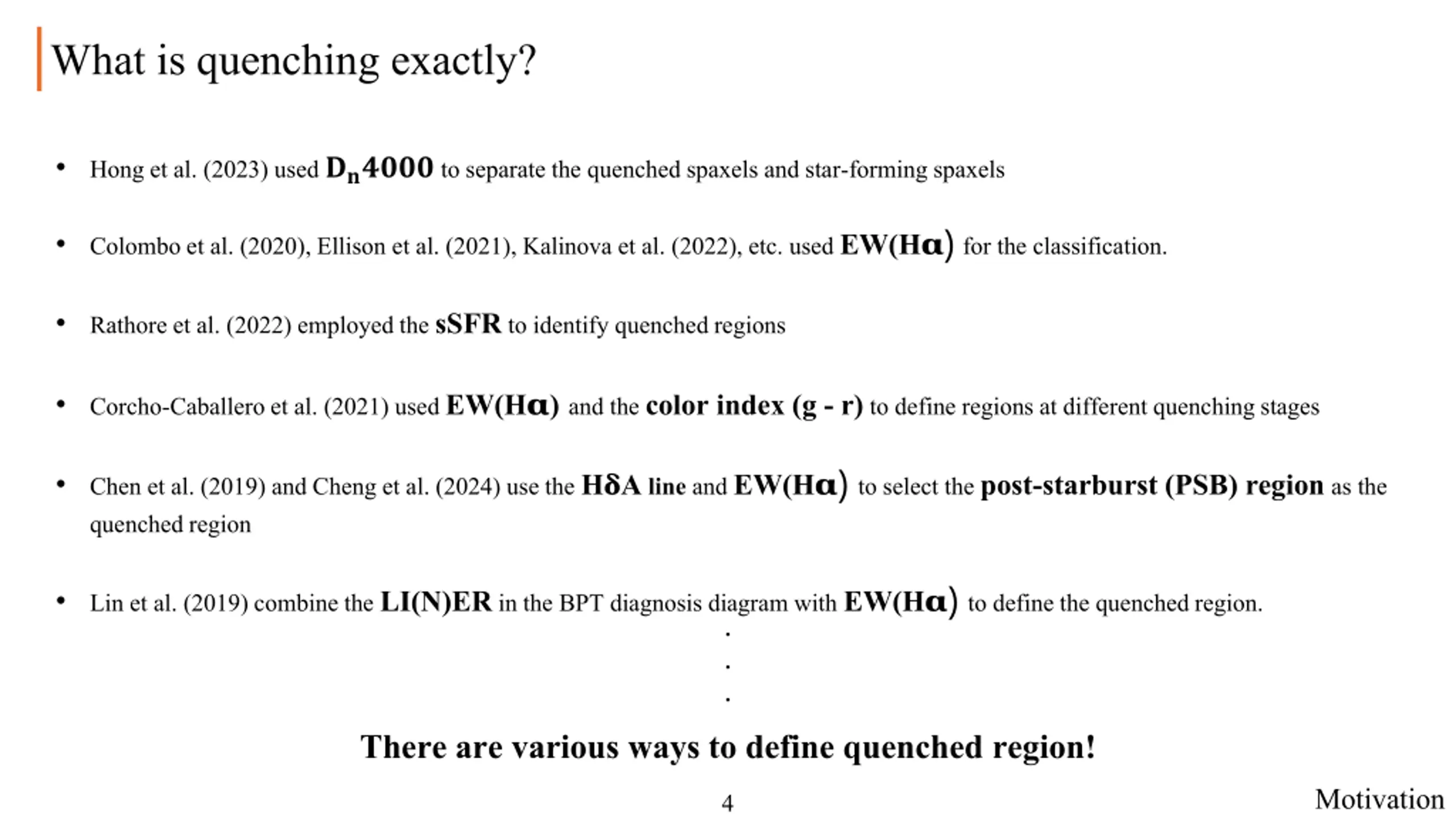 What is quenching exactly? Hong et al. (2023) used?????? to separate the quenched spaxels and star-forming spaxels Colombo et al. (2020), Ellison et al. (2021), Kalinova et al. (2022), etc. used EW(H ) for the classification. Rathore et al. (2022) employed the sSFR to identify quenched regions Corcho-Caballero et al. (2021) used EW(H ) and the color index (g - r)to define regions at different quenching stages Chen et al. (2019) and Cheng et al. (2024) use the H A line and EW(H ) to select the post-starburst (PSB) region as the quenched region Lin et al. (2019) combine the LI(N)ERin the BPT diagnosis diagram with EW(H ) to define the quenched region. . . . There are various ways to define quenched region! 4 Motivation