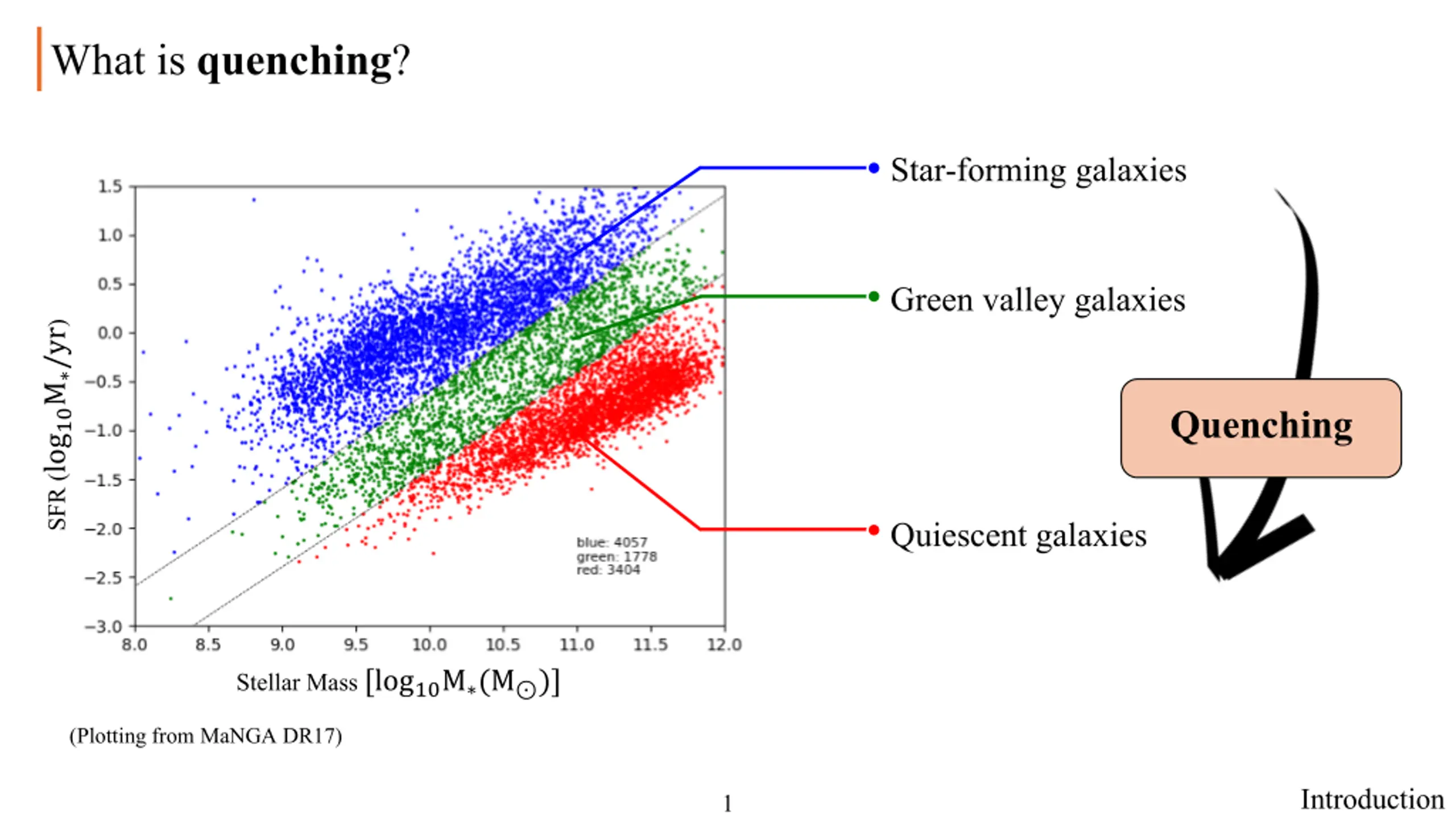 What is quenching? Star-forming galaxies Green valley galaxies SFR (log10M /yr) Quenching Quiescent galaxies Stellar Mass [log10M (M )] (Plotting from MaNGA DR17) Introduction 1