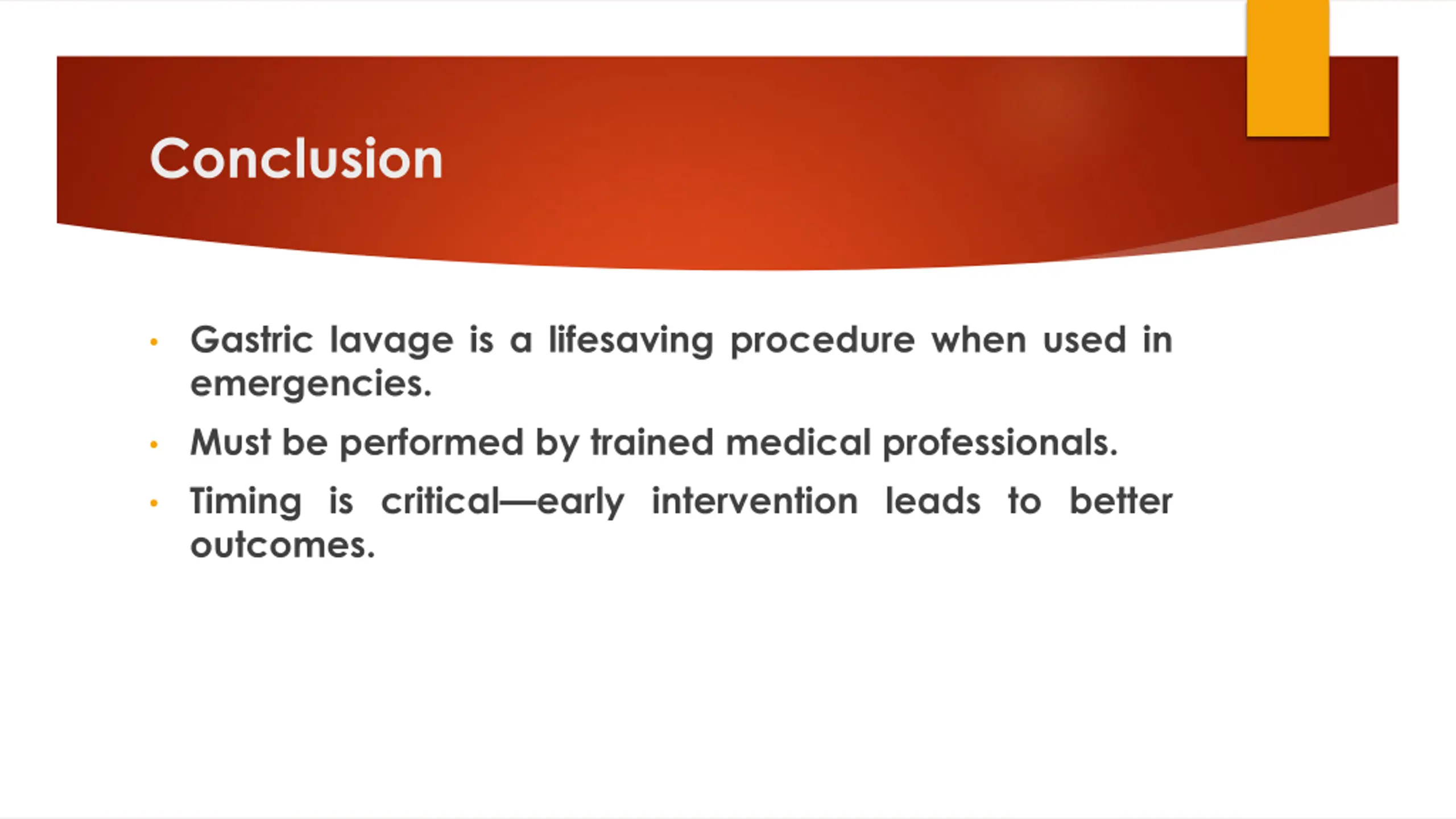 Conclusion Gastric lavage is a lifesaving procedure when used in emergencies. Must be performed by trained medical professionals. Timing is critical early intervention leads to better outcomes.