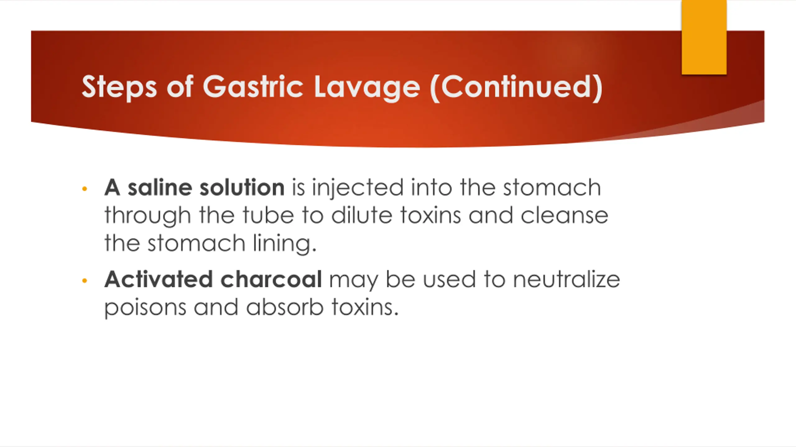 Steps of Gastric Lavage (Continued) A saline solution is injected into the stomach through the tube to dilute toxins and cleanse the stomach lining. Activated charcoal may be used to neutralize poisons and absorb toxins.