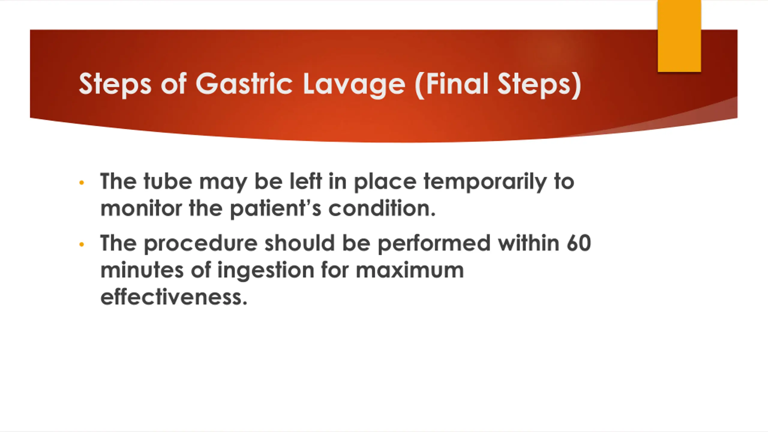 Steps of Gastric Lavage (Final Steps) The tube may be left in place temporarily to monitor the patient s condition. The procedure should be performed within 60 minutes of ingestion for maximum effectiveness.