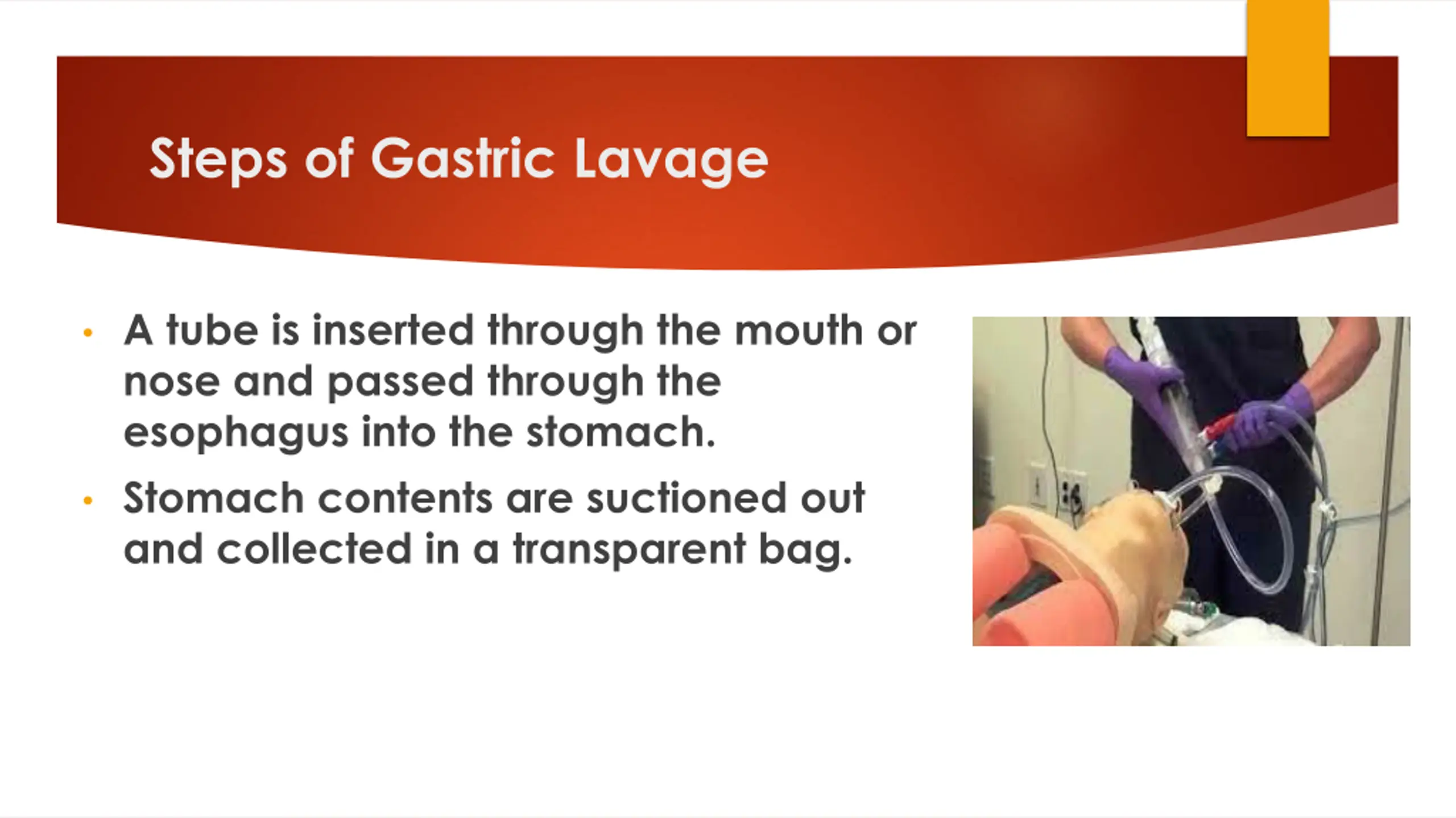 Steps of Gastric Lavage A tube is inserted through the mouth or nose and passed through the esophagus into the stomach. Stomach contents are suctioned out and collected in a transparent bag.