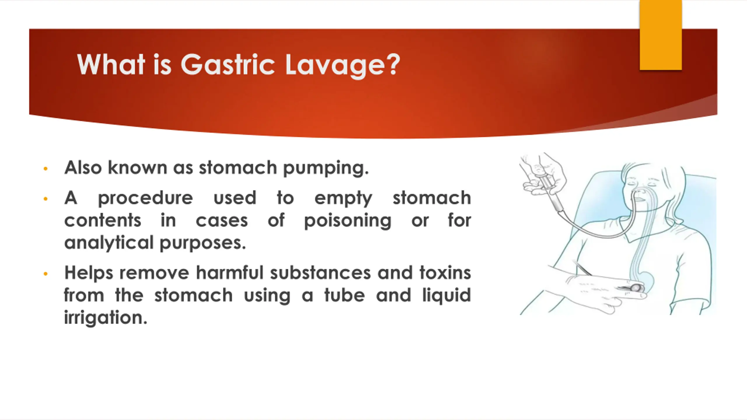 What is Gastric Lavage? Also known as stomach pumping. A procedure contents in cases analytical purposes. Helps remove harmful substances and toxins from the stomach using a tube and liquid irrigation. used to empty poisoning stomach or of for