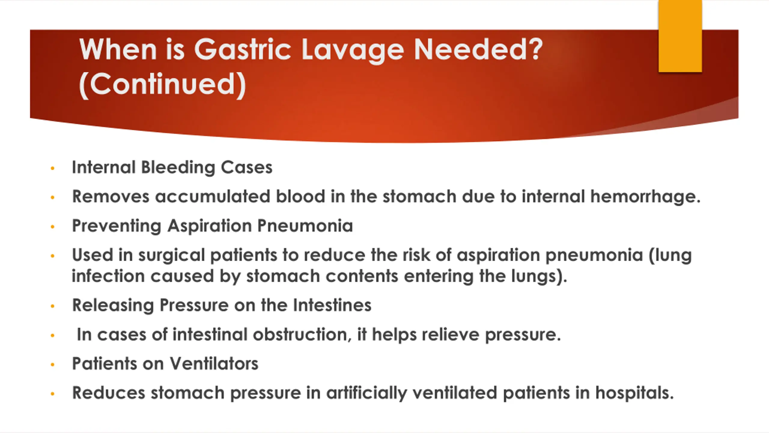 When is Gastric Lavage Needed? (Continued) Internal Bleeding Cases Removes accumulated blood in the stomach due to internal hemorrhage. Preventing Aspiration Pneumonia Used in surgical patients to reduce the risk of aspiration pneumonia (lung infection caused by stomach contents entering the lungs). Releasing Pressure on the Intestines In cases of intestinal obstruction, it helps relieve pressure. Patients on Ventilators Reduces stomach pressure in artificially ventilated patients in hospitals.