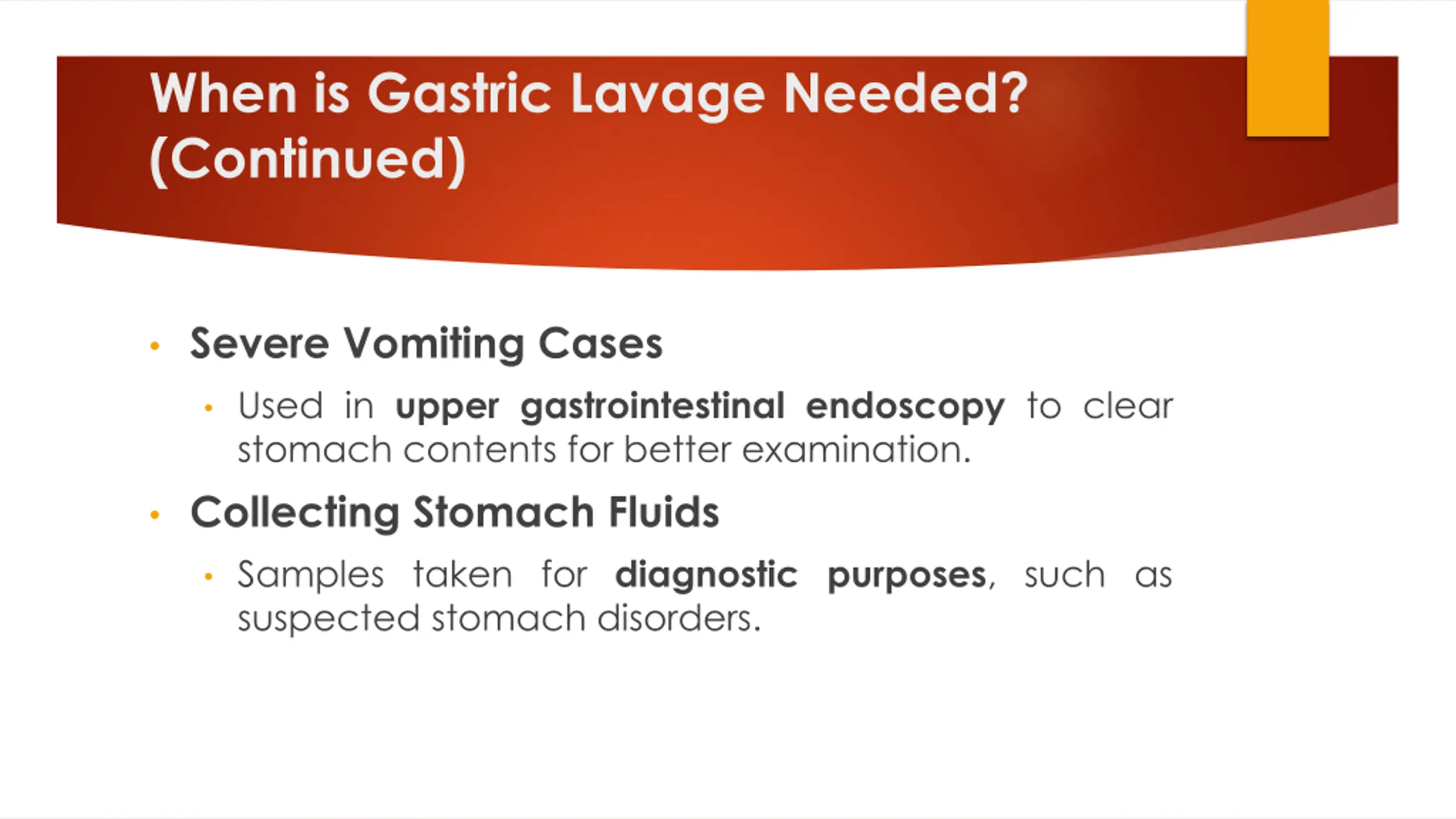 When is Gastric Lavage Needed? (Continued) Severe Vomiting Cases Used in upper gastrointestinal endoscopy to clear stomach contents for better examination. Collecting Stomach Fluids Samples taken for diagnostic purposes, such as suspected stomach disorders.