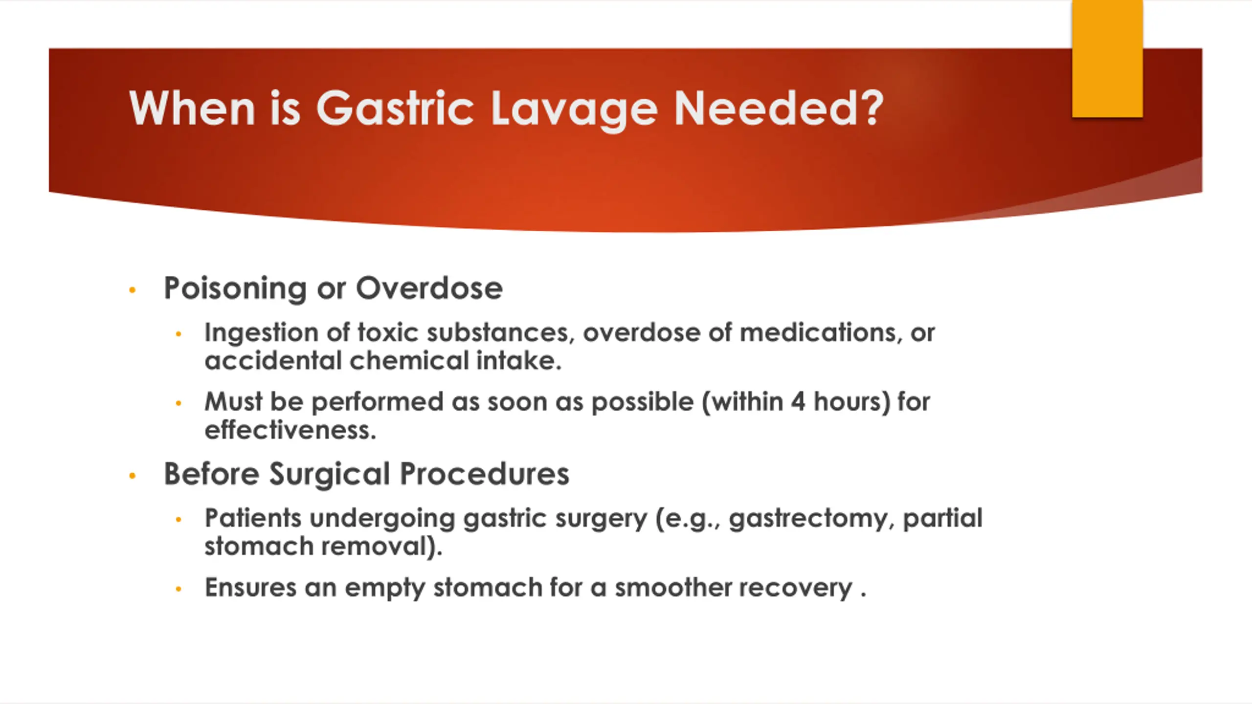 When is Gastric Lavage Needed? Poisoning or Overdose Ingestion of toxic substances, overdose of medications, or accidental chemical intake. Must be performed as soon as possible (within 4 hours) for effectiveness. Before Surgical Procedures Patients undergoing gastric surgery (e.g., gastrectomy, partial stomach removal). Ensures an empty stomach for a smoother recovery .