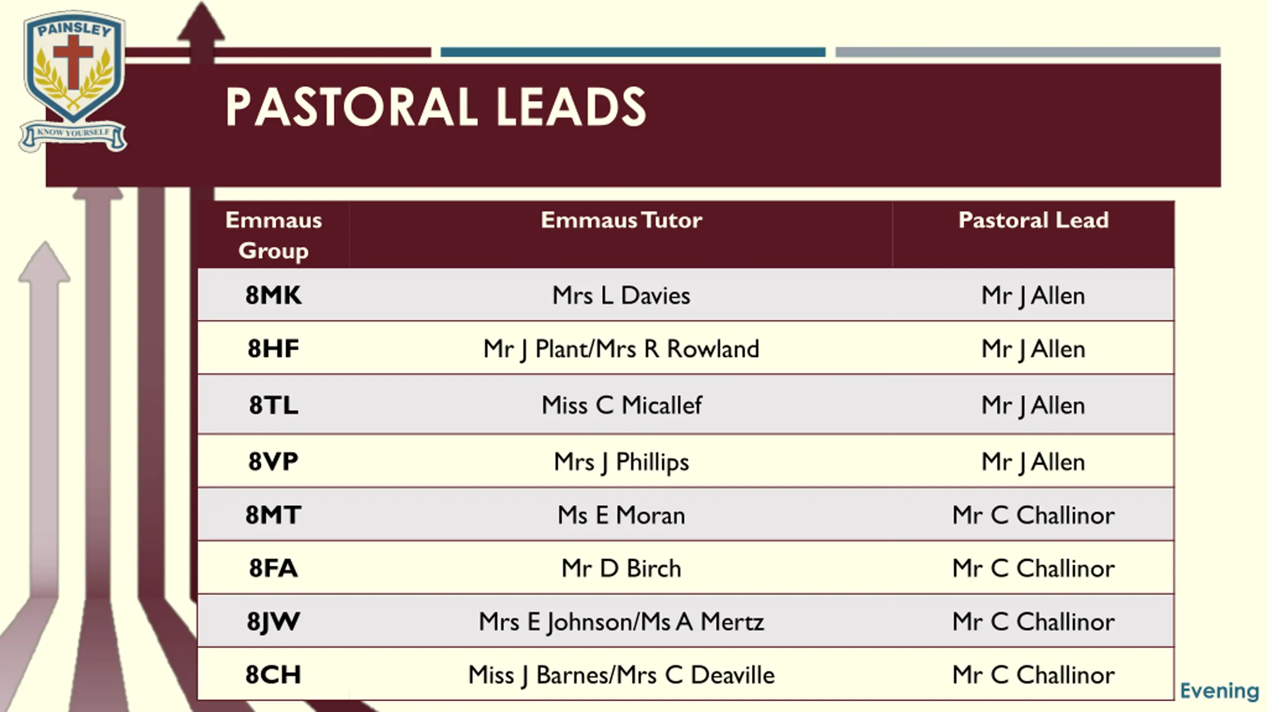PASTORAL LEADS Emmaus Group Emmaus Tutor Pastoral Lead 8MK Mrs L Davies Mr J Allen Mr J Allen Mr J Plant/Mrs R Rowland 8HF Miss C Micallef Mr J Allen 8TL Mrs J Phillips 8VP Mr J Allen Ms E Moran Mr C Challinor 8MT Mr C Challinor 8FA Mr D Birch Mrs E Johnson/Ms A Mertz Mr C Challinor 8JW Miss J Barnes/Mrs C Deaville 8CH Mr C Challinor Year 8 Curriculum Evening