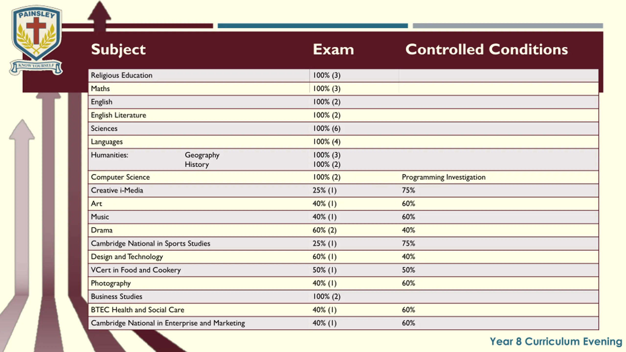 Subject Exam Controlled Conditions Religious Education 100% (3) Maths 100% (3) English 100% (2) English Literature 100% (2) Sciences 100% (6) Languages 100% (4) Humanities: Computer Science Geography History 100% (3) 100% (2) 100% (2) Programming Investigation Creative i-Media 25% (1) 75% Art 40% (1) 60% Music 40% (1) 60% Drama 60% (2) 40% Cambridge National in Sports Studies 25% (1) 75% Design and Technology 60% (1) 40% VCert in Food and Cookery 50% (1) 50% Photography 40% (1) 60% Business Studies 100% (2) BTEC Health and Social Care 40% (1) 60% Cambridge National in Enterprise and Marketing 40% (1) 60% Year 8 Curriculum Evening