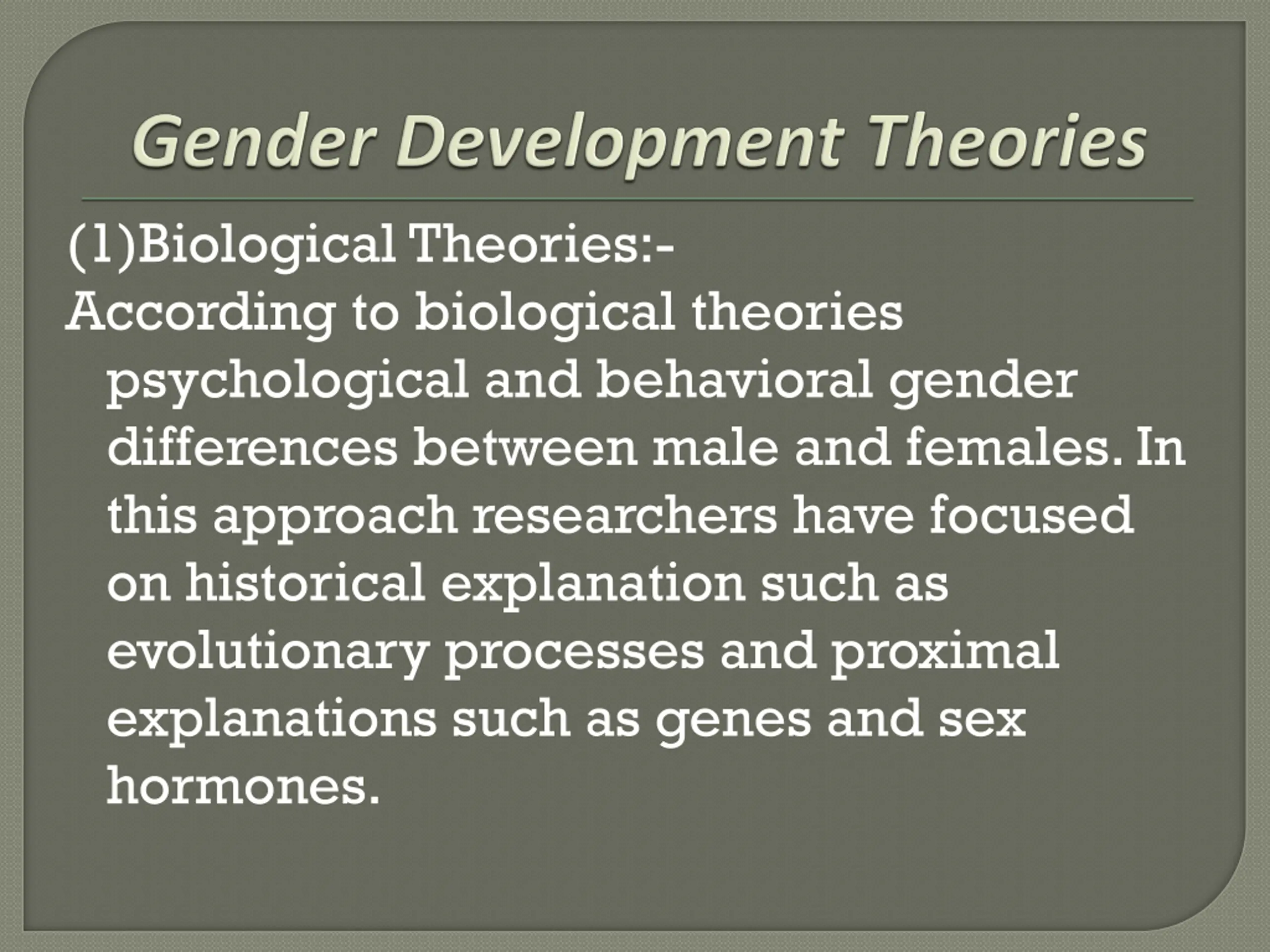 (1)Biological Theories:- According to biological theories psychological and behavioral gender differences between male and females. In this approach researchers have focused on historical explanation such as evolutionary processes and proximal explanations such as genes and sex hormones.