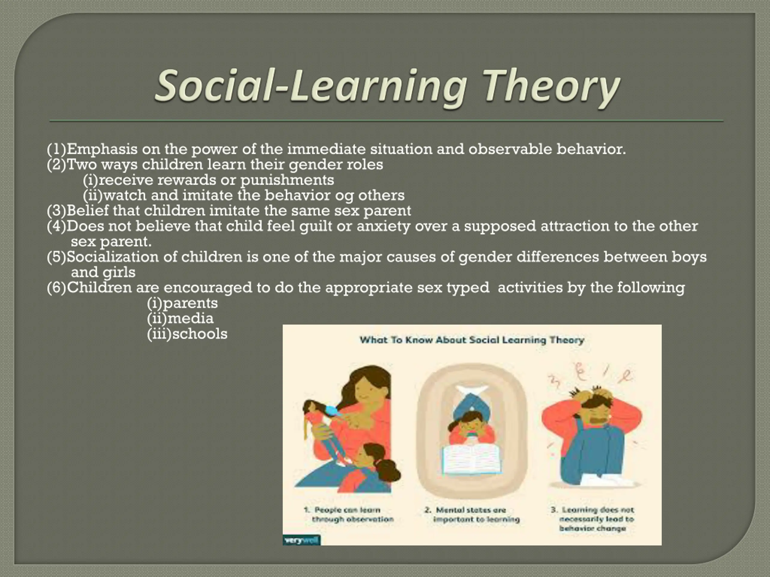 (1)Emphasis on the power of the immediate situation and observable behavior. (2)Two ways children learn their gender roles (i)receive rewards or punishments (ii)watch and imitate the behavior og others (3)Belief that children imitate the same sex parent (4)Does not believe that child feel guilt or anxiety over a supposed attraction to the other sex parent. (5)Socialization of children is one of the major causes of gender differences between boys and girls (6)Children are encouraged to do the appropriate sex typed activities by the following (i)parents (ii)media (iii)schools