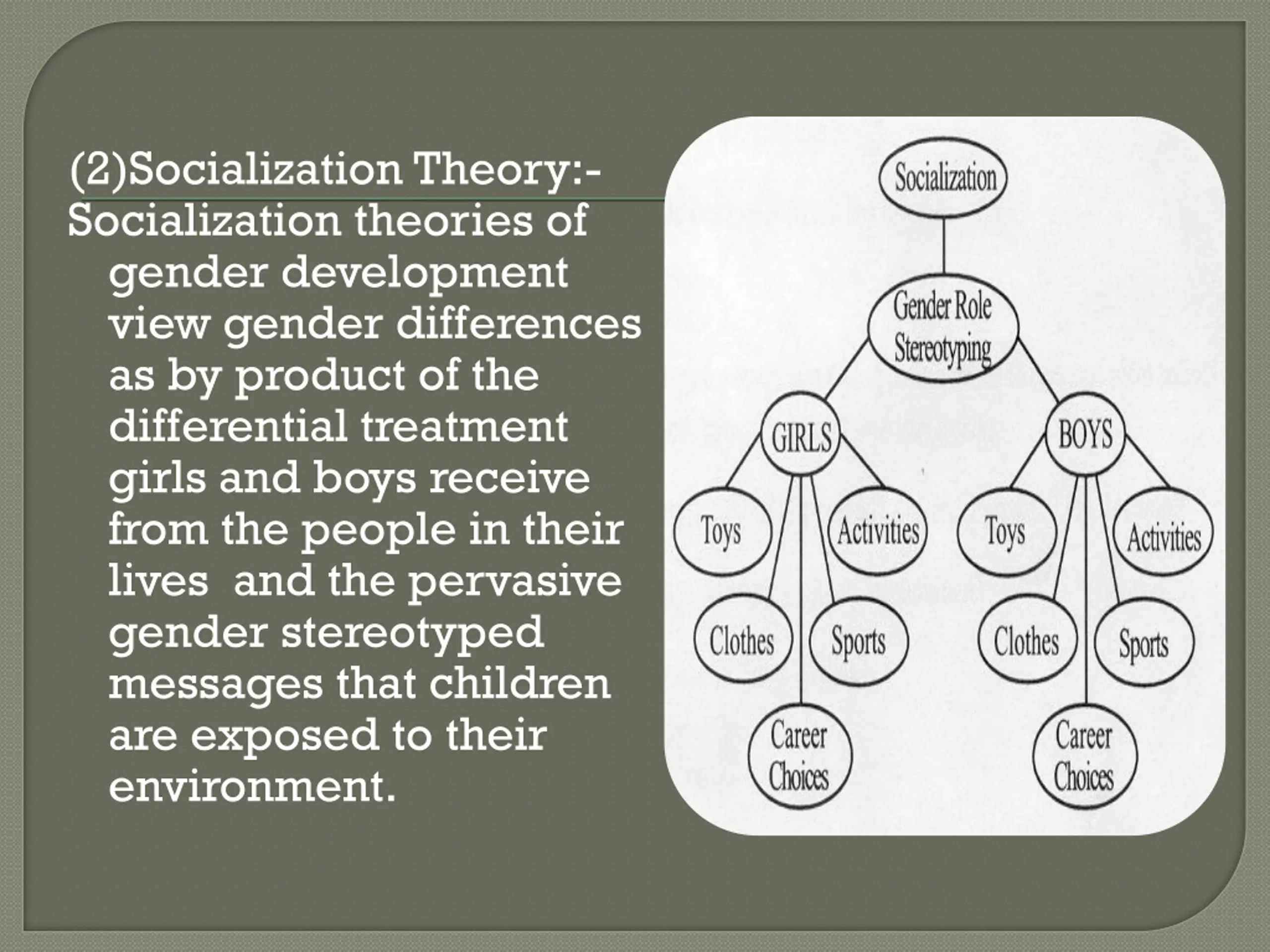 (2)Socialization Theory:- Socialization theories of gender development view gender differences as by product of the differential treatment girls and boys receive from the people in their lives and the pervasive gender stereotyped messages that children are exposed to their environment.