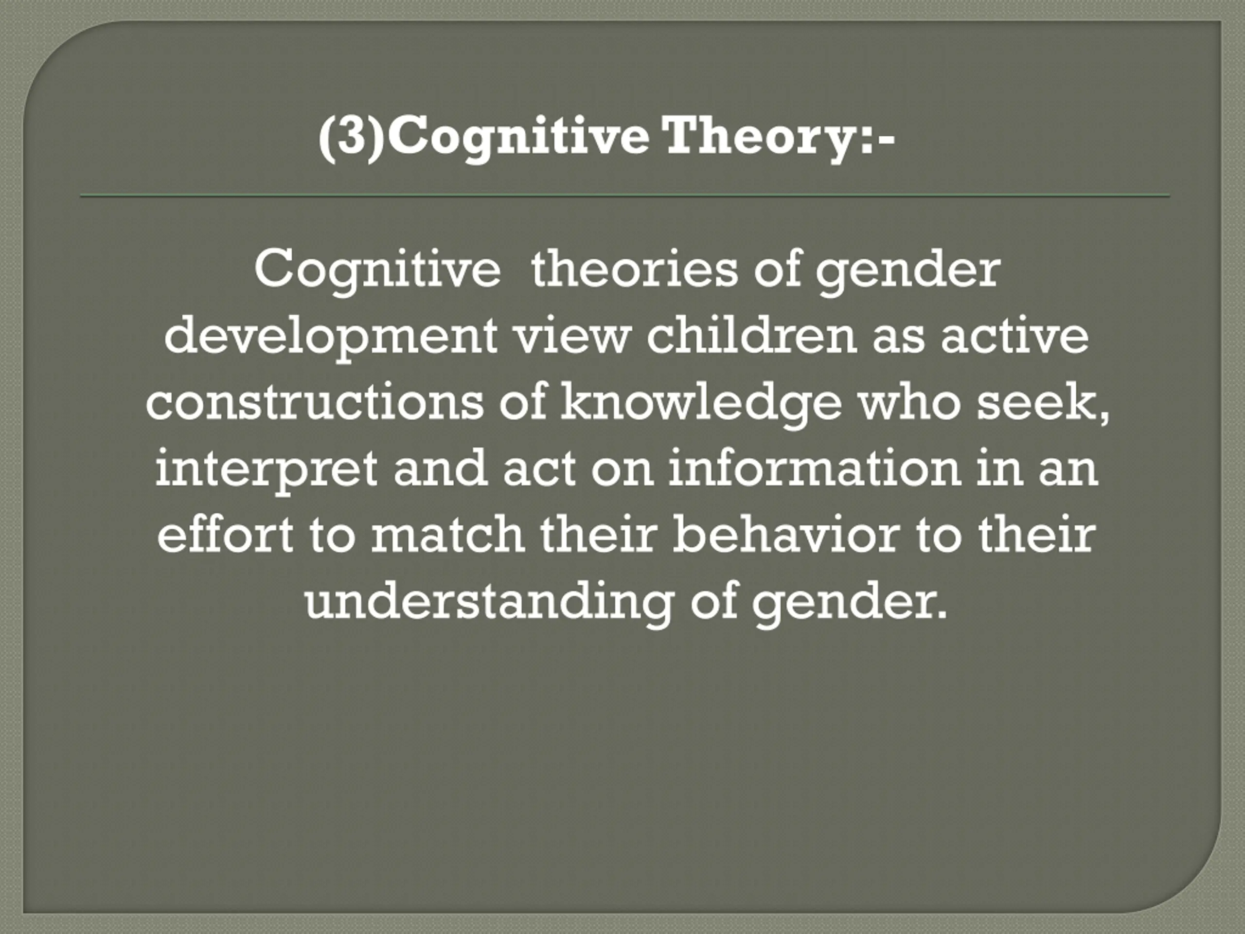 (3)Cognitive Theory:- Cognitive theories of gender development view children as active constructions of knowledge who seek, interpret and act on information in an effort to match their behavior to their understanding of gender.