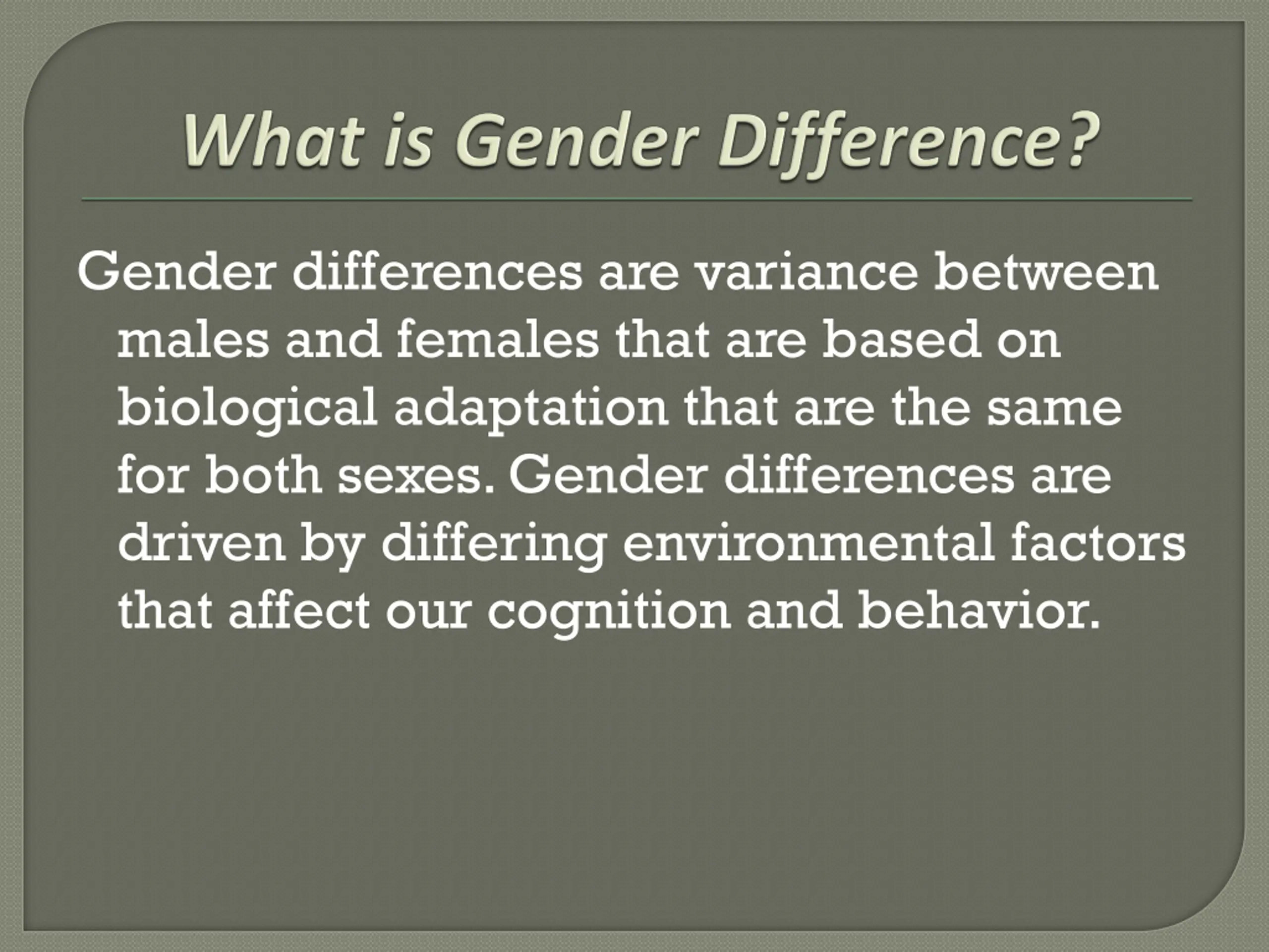 Gender differences are variance between males and females that are based on biological adaptation that are the same for both sexes. Gender differences are driven by differing environmental factors that affect our cognition and behavior.