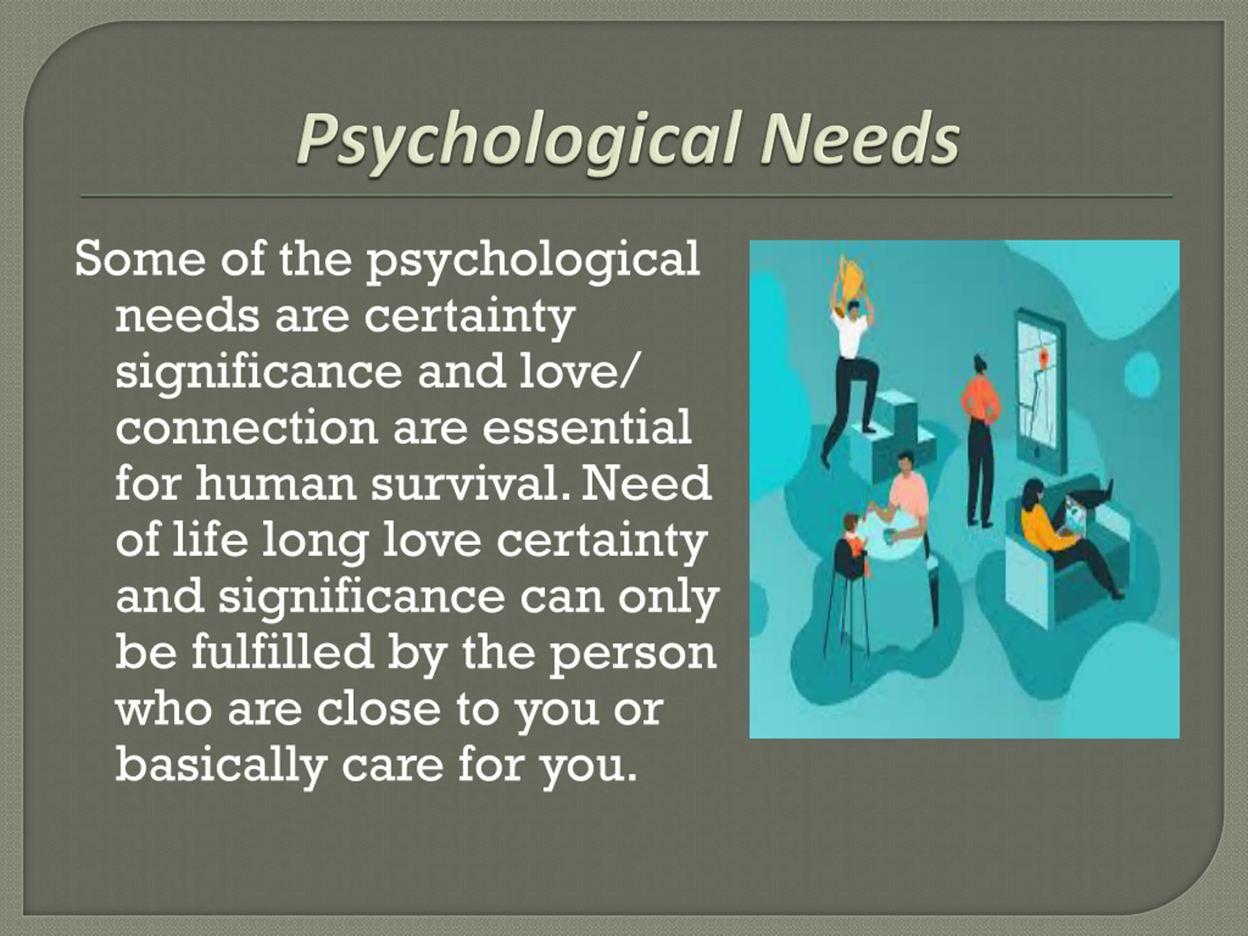 Some of the psychological needs are certainty significance and love/ connection are essential for human survival. Need of life long love certainty and significance can only be fulfilled by the person who are close to you or basically care for you.