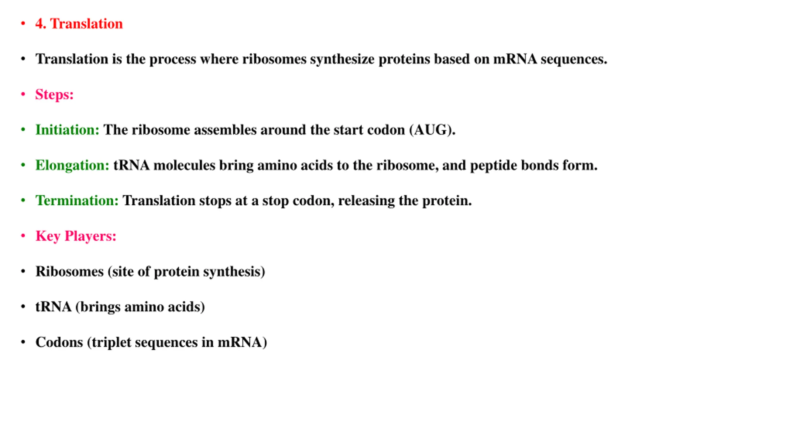 4. Translation Translation is the process where ribosomes synthesize proteins based on mRNA sequences. Steps: Initiation: The ribosome assembles around the start codon (AUG). Elongation: tRNA molecules bring amino acids to the ribosome, and peptide bonds form. Termination: Translation stops at a stop codon, releasing the protein. Key Players: Ribosomes (site of protein synthesis) tRNA (brings amino acids) Codons (triplet sequences in mRNA)
